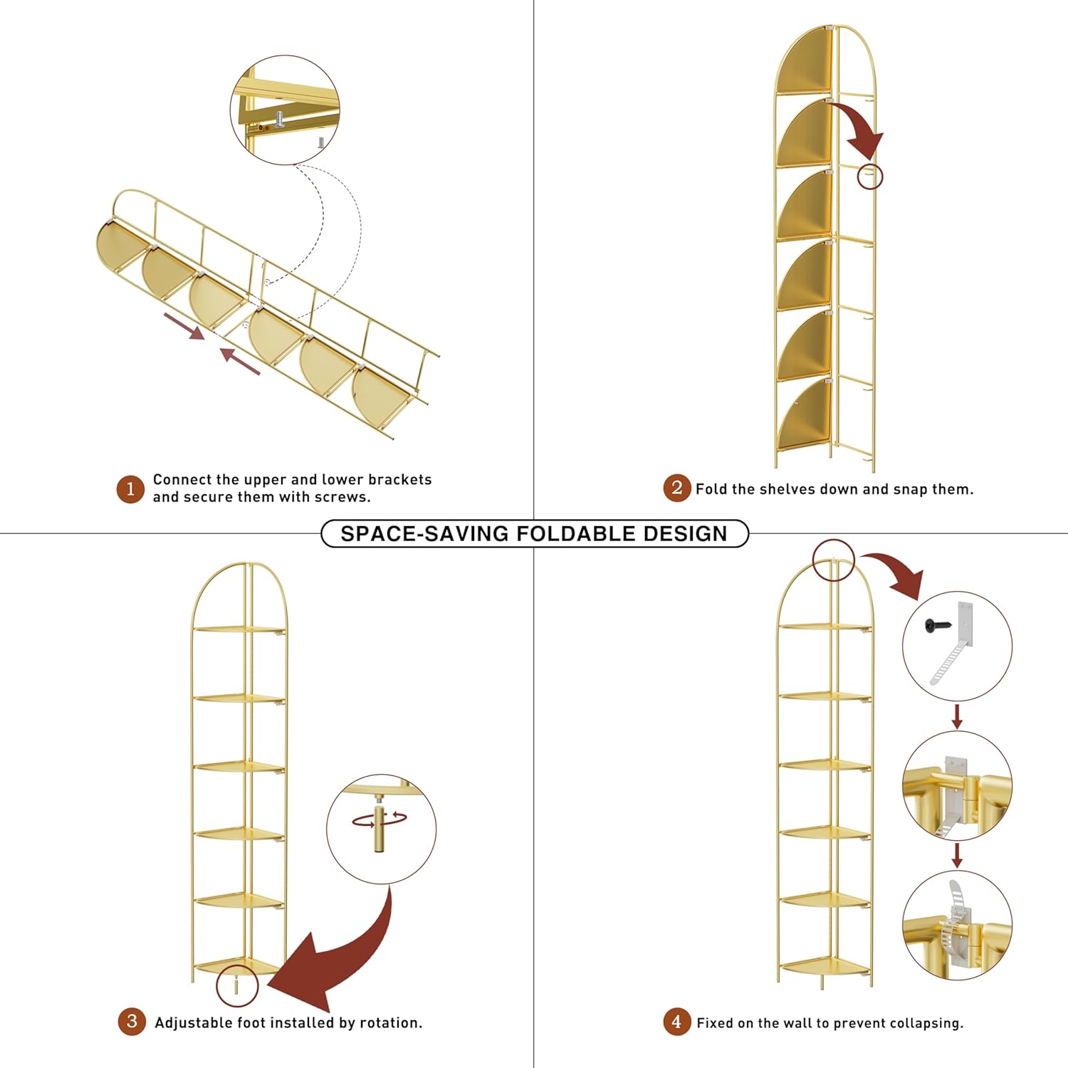Crofy Foldable 6 Tier Corner Shelf, Metal Corner Plant Stand with Gold Frame and Gold Shelves, Corner Display Rack Multipurpose Shelving Unit for Living Room, Bedroom, Bathroom