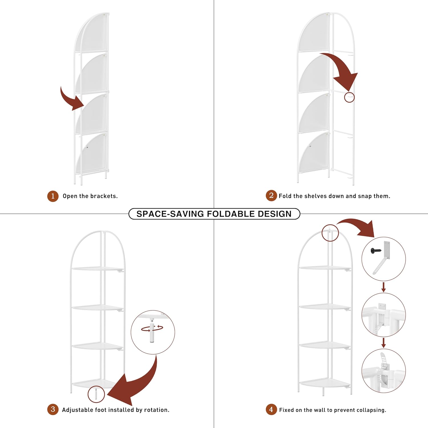 Crofy Foldable 4 Tier Corner Shelf, Metal Corner Plant Stand with White Frame and White Shelves, Corner Display Rack Multipurpose Shelving Unit for Living Room, Bedroom, Bathroom