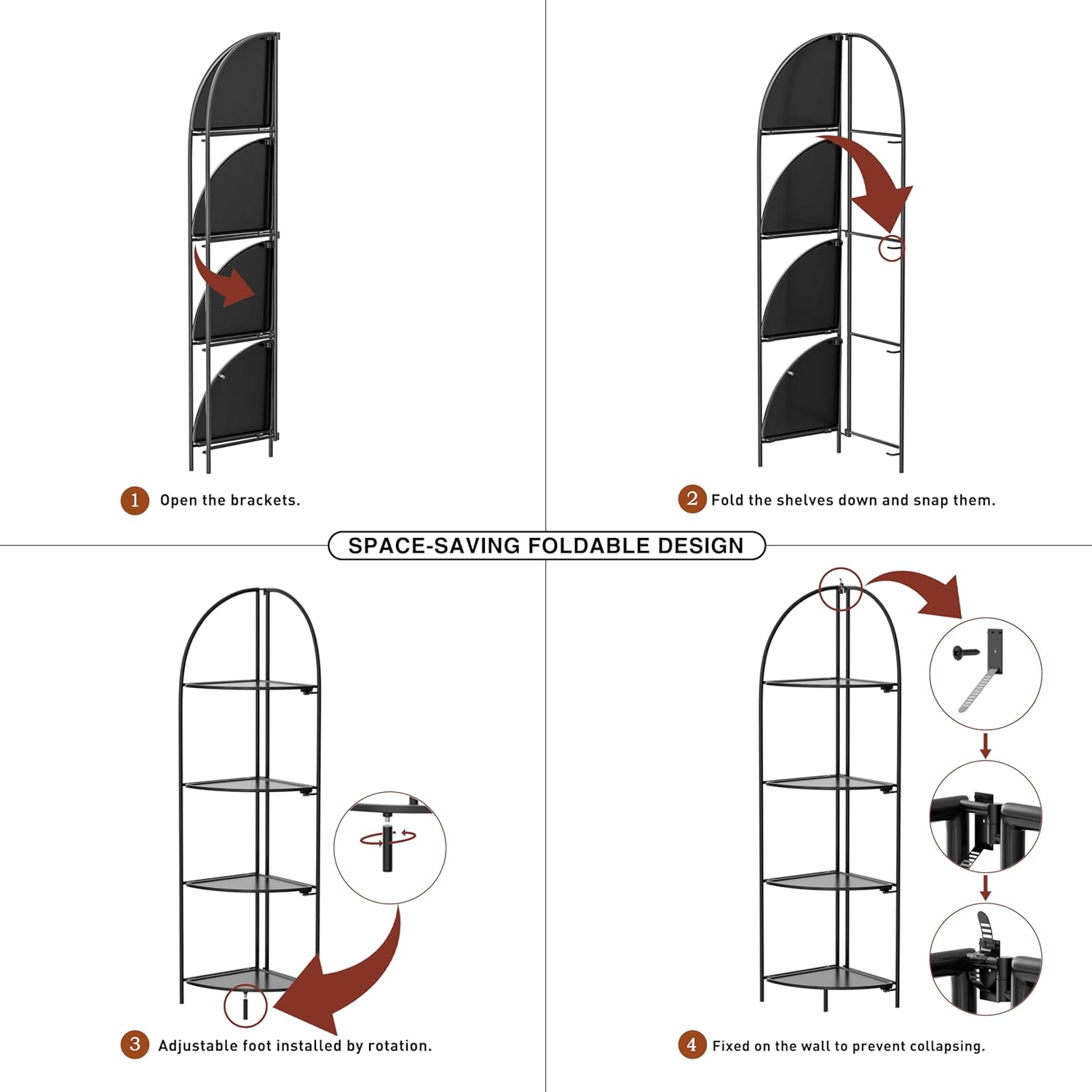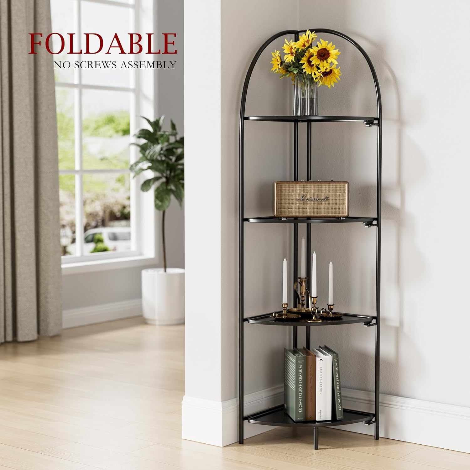 Crofy Foldable 4 Tier Corner Shelf, Metal Corner Plant Stand with Black Frame and Black Shelves, Corner Display Rack Multipurpose Shelving Unit for Living Room, Bedroom, Bathroom