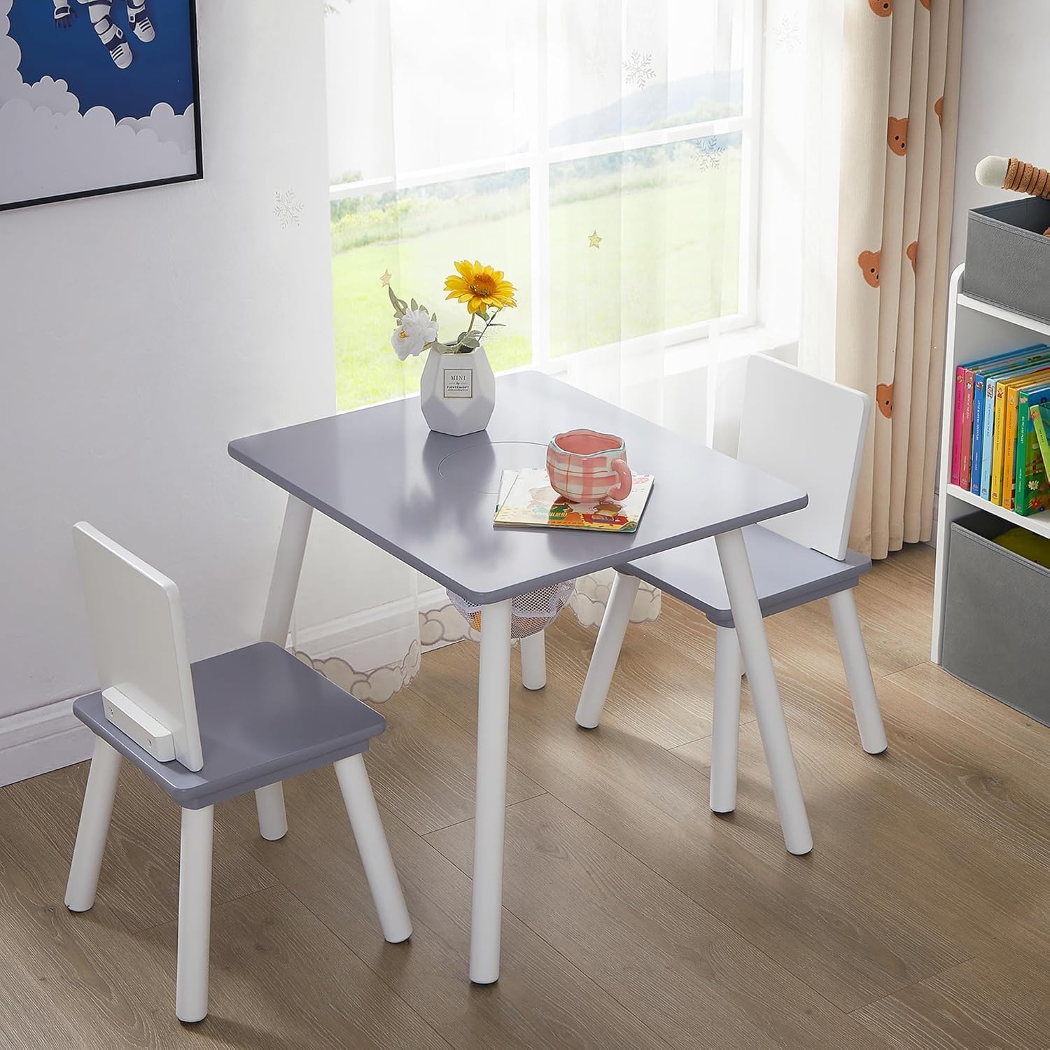 VECELO Activity Table and 2 Chair Set with Hidden Mesh Storage, Durable Playroom Furniture, Modern Design, Easy Assembly, Grey & White