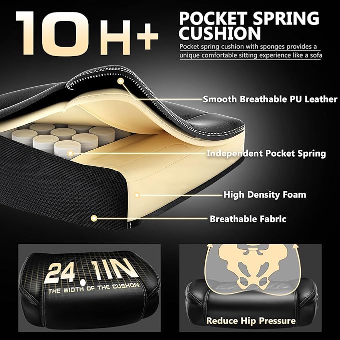 - 👉【Extra Wide Breathable PU Leather Large Office Chair】:Our executive office chair is equipped with a spring cushion to reduce hip pressure. The extra-wide chair backrest and independent lumbar support gently wraps your body and supports your lower back, thoughtfully designed to keep you comfortable during long hours of working, studying or gaming.