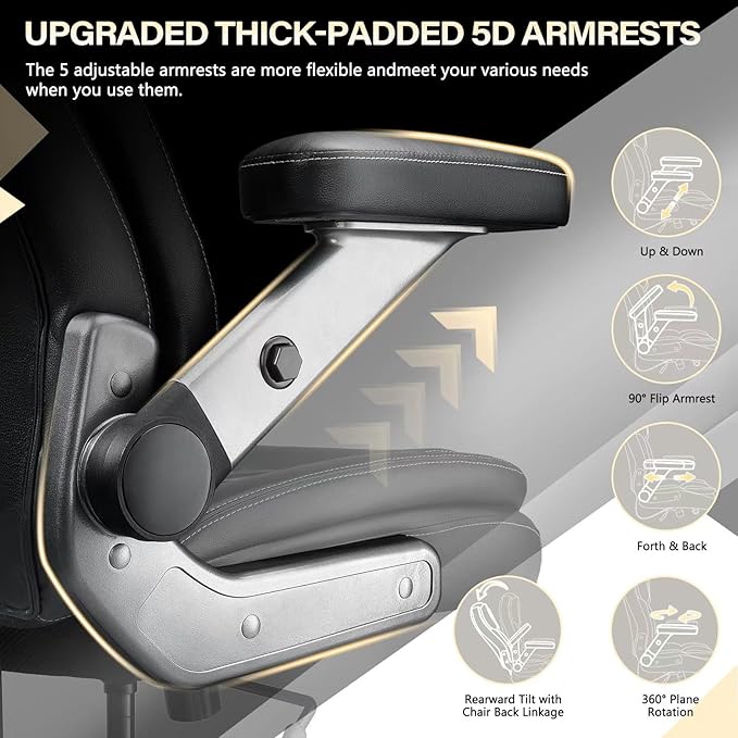 - 👉【Space-Efficient 5D Armrests with Optimized Utilization】:Need a stylish large home office chair for your work-from-home or shared office setup? No problem! The big and tall office chair with its ergonomic 5D flip arm design minimizes spatial requirements. The arm rests can be mounted on the back and then you can push them back for no arm rest which is very comfortable and handy. Prepare to swivel and roll your way to productivity paradise! This large desk chair doesn't just sit there looking pretty. It's a multitasking marvel