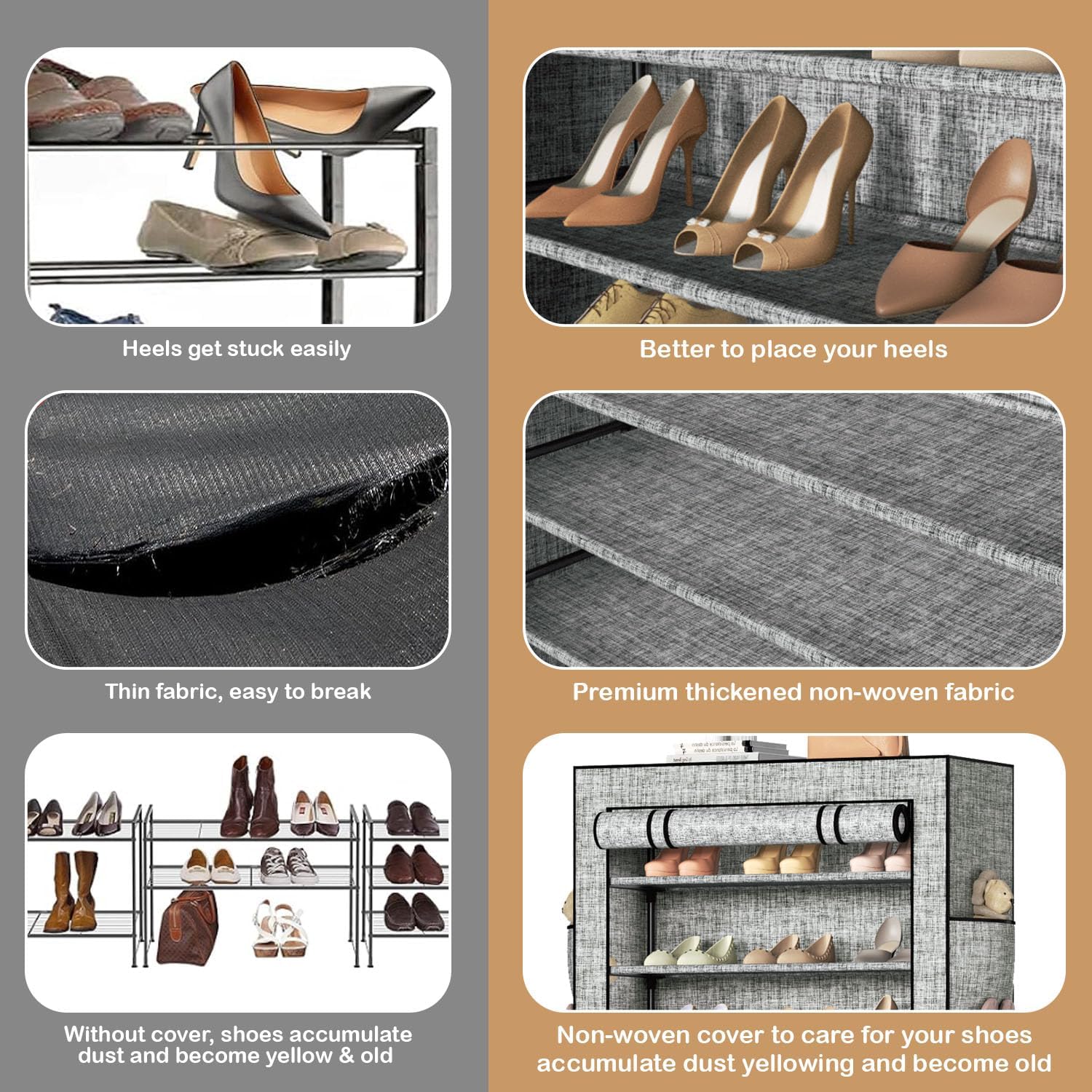- ăUPGRADED THICKENED PREMIUM QUALITY DUST COVER, MORE EFFECTIVE WATER AND DUST RESISTANCEă- High quality thickened non-woven dust cover, compared to the ordinary model dust cover which is only less than 60 grams, our thickened high quality dust cover is 100 grams, doubled on the basis of the ordinary model, which makes your free standing shoe racks more textured, thus meeting your needs for a high-quality tall shoe shelf, at the same time, protects your shoes from dust, glare and dirt, and takes better care of your shoes to ensure that the Shoe Cleanliness.