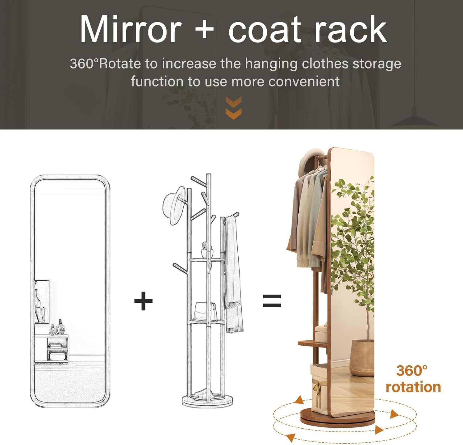 - 【Quality Materials & High Quality Design】 This full length mirror with stand is made of solid wood frame made of FAS-grade rubberwood, which has a delicate texture, elegant and generous, and has been safely sprayed with lacquer, which is not easy to crack and long-lasting. The full length mirror with coat rack uses shatterproof glass to ensure higher safety. The multifunctional design that combines mirror, clothes hanging and storage adds convenience and style to your life, making it a durable and quality choice