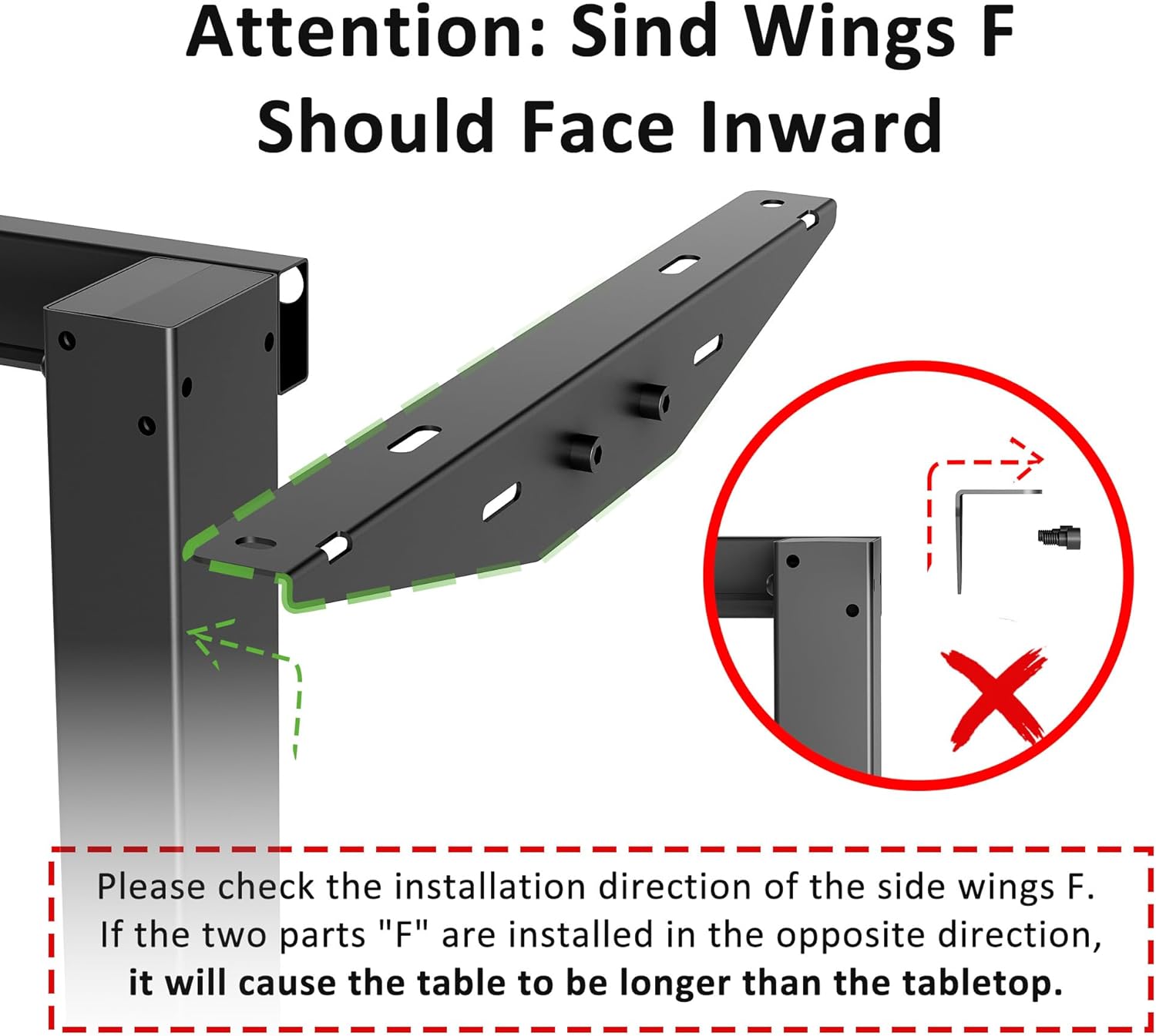 - Attention: Sind wings "F" should face inward. If the two parts "F" are installed in the opposite direction, it will cause the table to be longer than the tabletop.