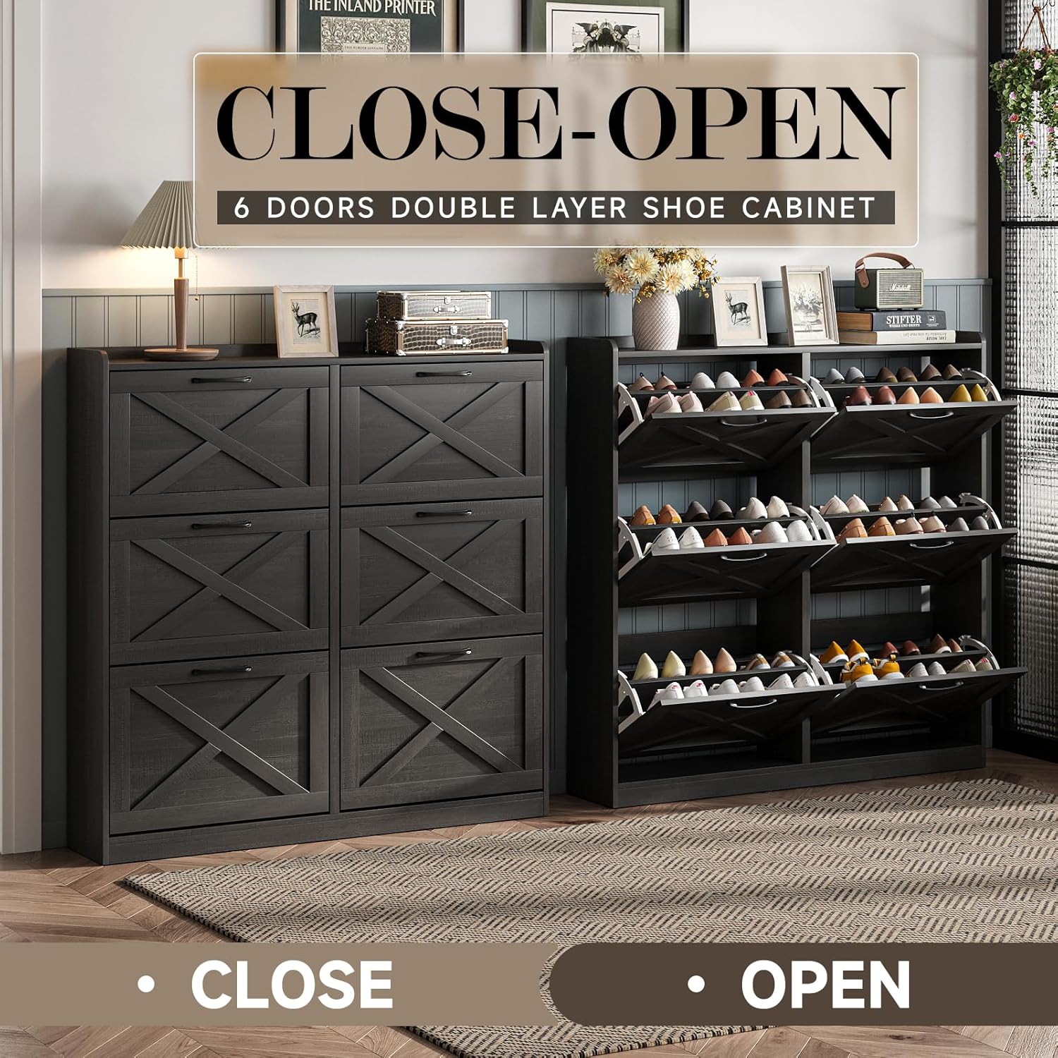 - Entryway Shoe Cabinet: The hidden shoe storage cabinet with 6 flip doors, stylish and simple black makes it a neat and beautiful finish and looks great in many different home styles. Perfect for placing in the entryway, hallway, living room, or porch, provides a neat looking in your home and space saving