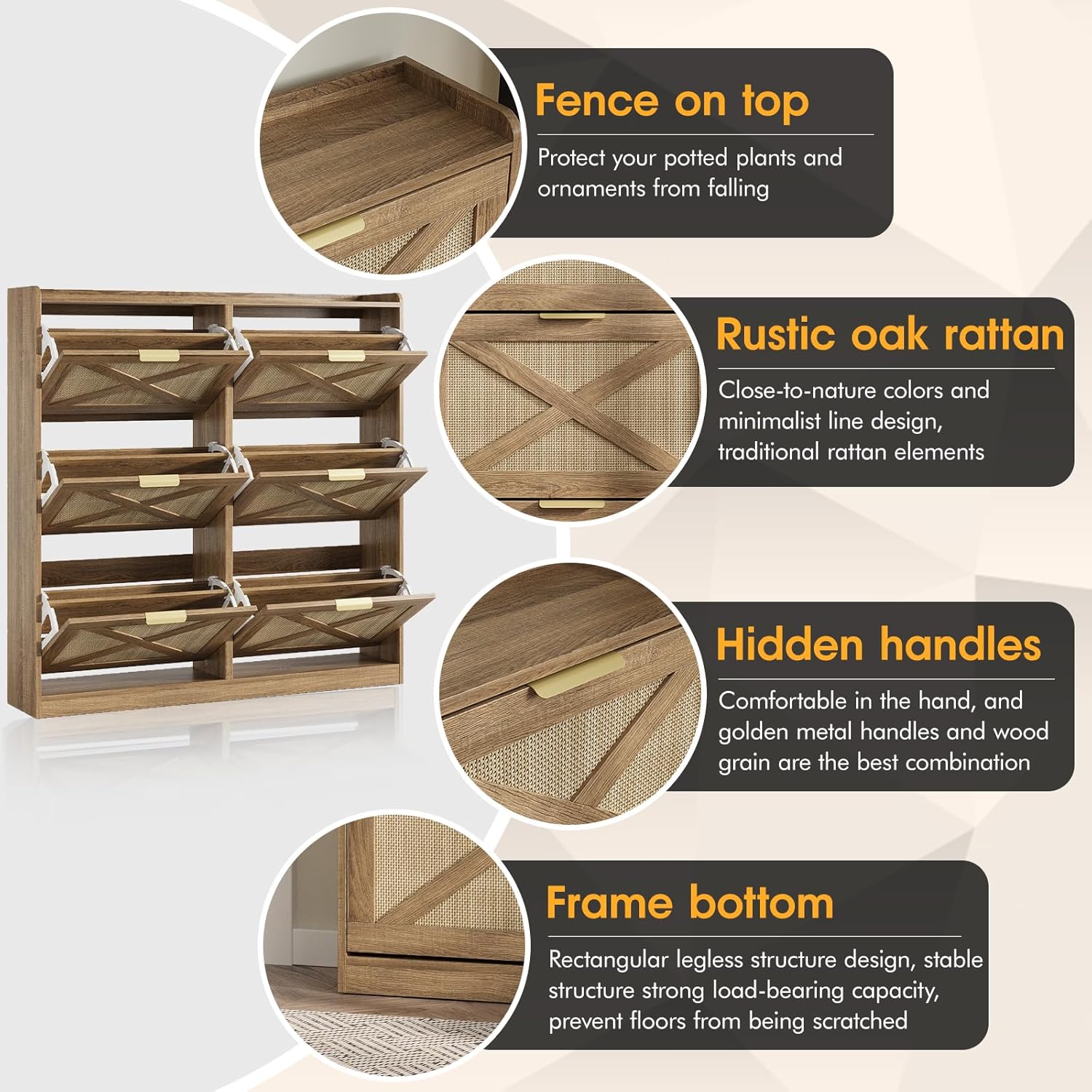 - Entryway Shoe Cabinet: The hidden shoe storage cabinet with 6 rattan flip doors, stylish and simple rustic oak rattan makes it a neat and beautiful finish and looks great in many different home styles. Perfect for placing in the entryway, hallway, living room, or porch, provides a neat looking in your home and space saving