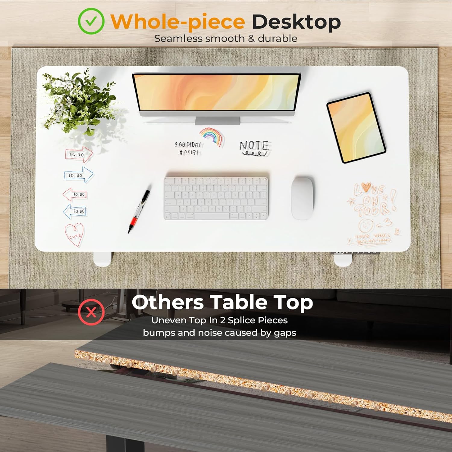 - Durable Glass Tabletop - The tempered glass desktop adds elegance and durability to the electric standing desk. Write or doodle on it with dry erase markers, then simply wipe clean to start fresh. More scratch resistant than wood boards