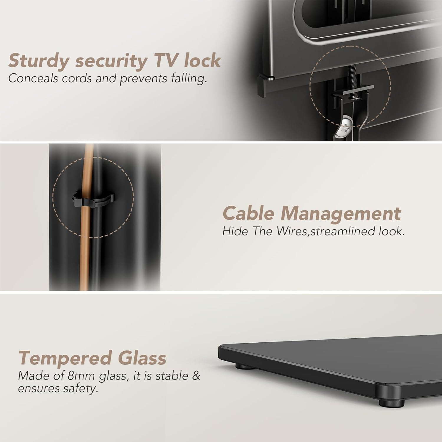- SMART DESIGN ☞ This smart floor TV stand comes with 10mm solid tempered glass base that connects to a solid steel pillar which provides stable support for your TV that creates a modern look for your audio video equipment, it can hold up to 77lbs
