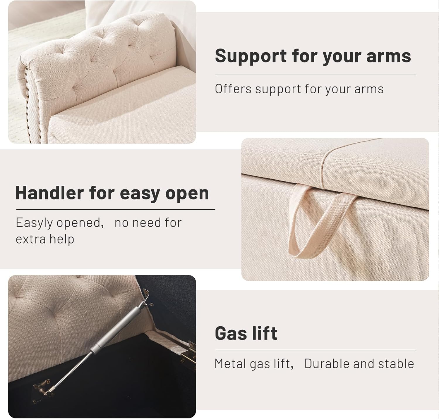 - ·Top-quality Planks&Sophisticated Mechanics: The ottoman bench frame made of multi-layer solid wood planks offers excellent breathability, durability, and support. The easy-lift and soft-close mechanism of the composite hinge and support arm structure ensures that the seat surface opens smoothly. It allows for easy and slow closure, providing a safe and effortless user experience.