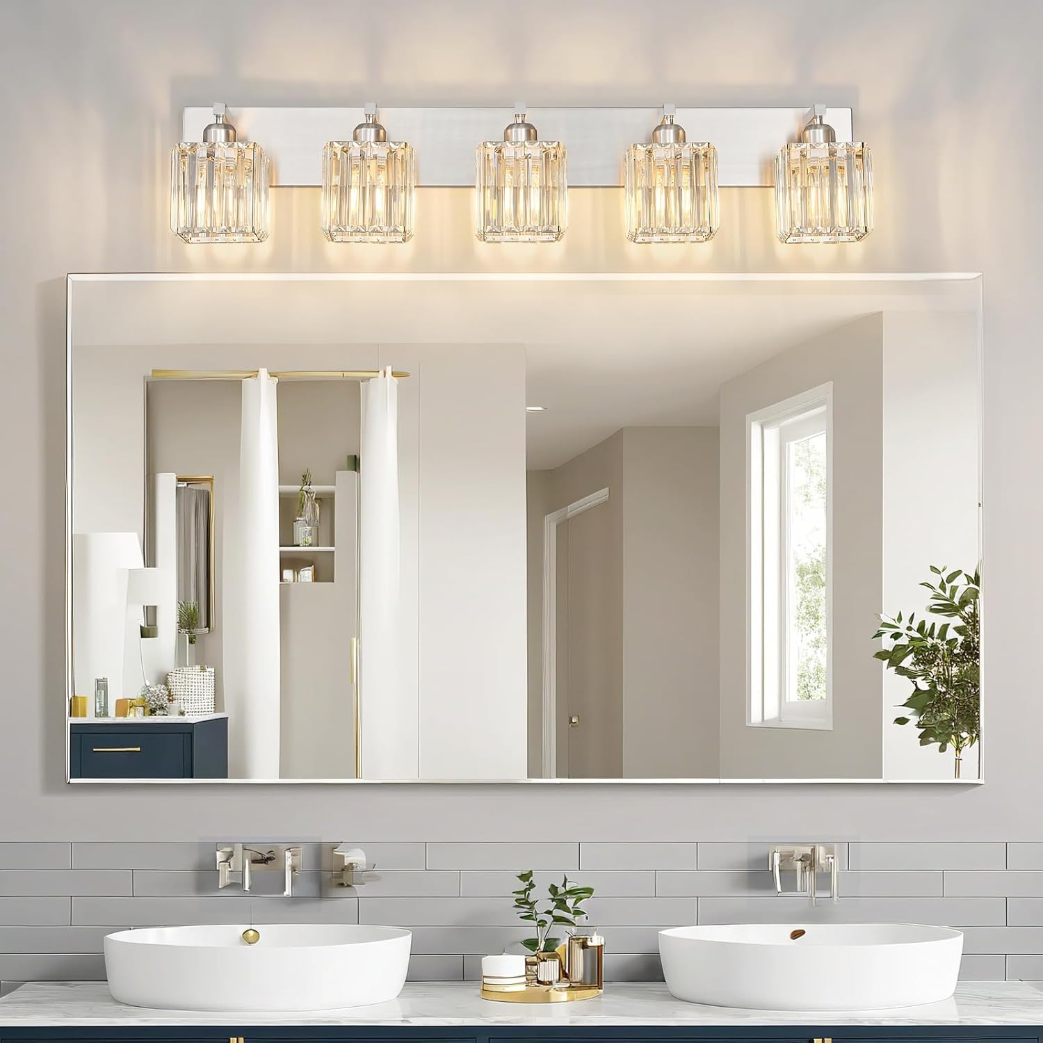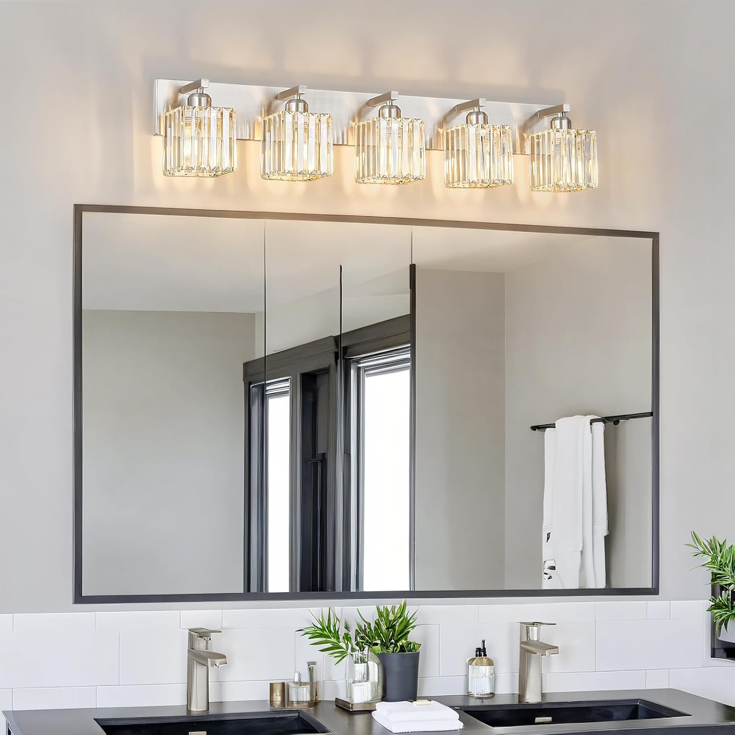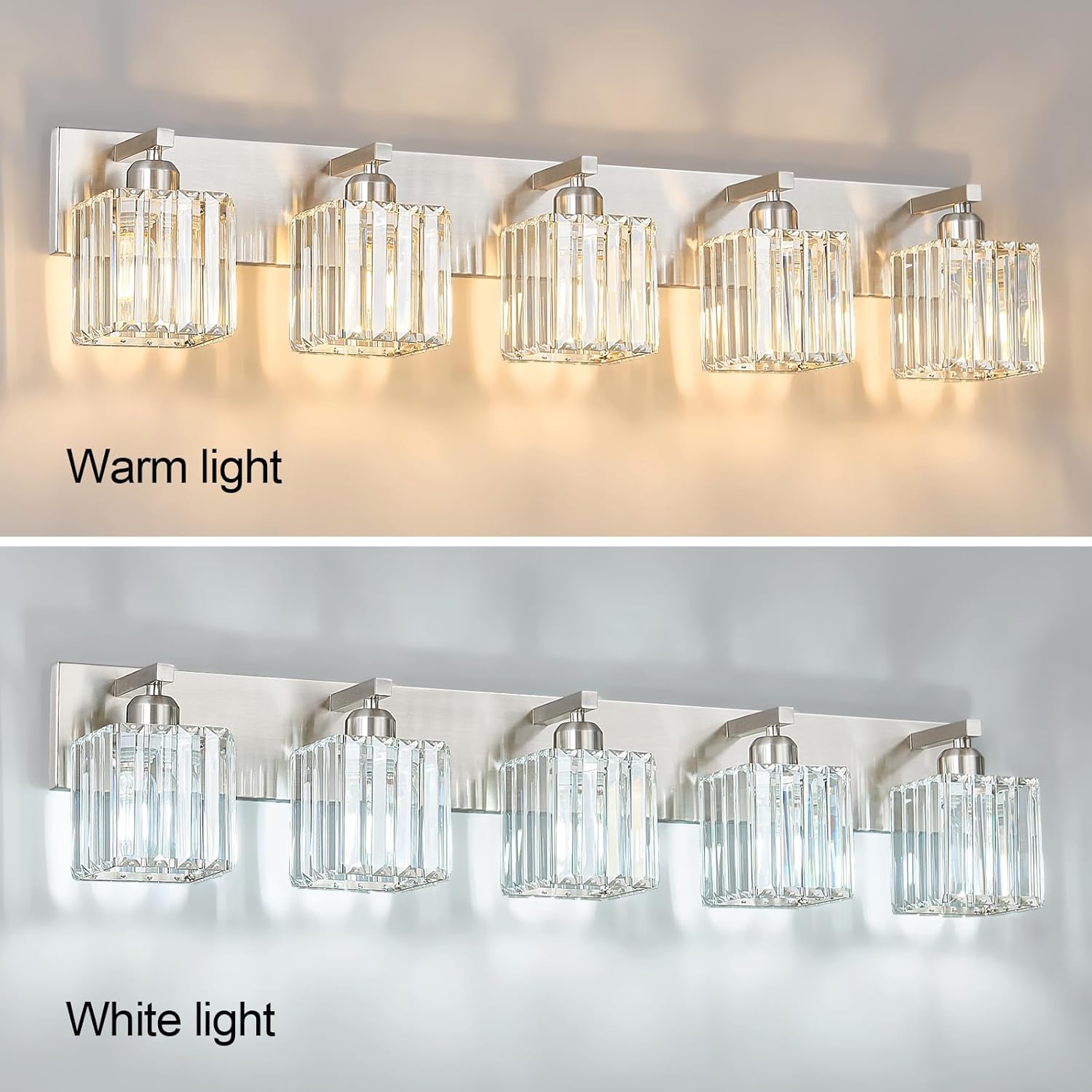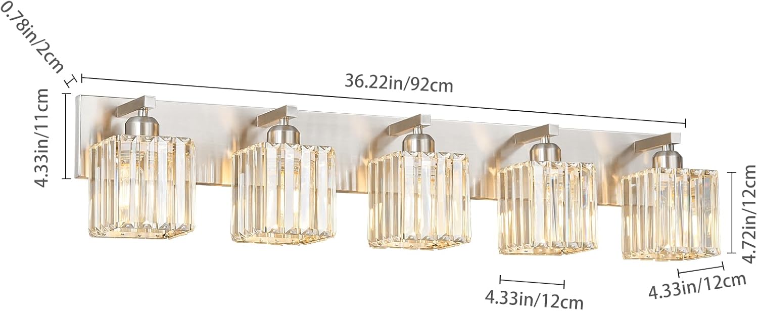 - [High quality manufacturing] Bathroom lights shade is made of clear K9 crystal, base and arm are made of brushed nickel finish , corrosion and moisture resistant, sturdy and durable. Can create a beautiful lighting effect, bathroom vanity lighting simple and luxurious design shows your taste.