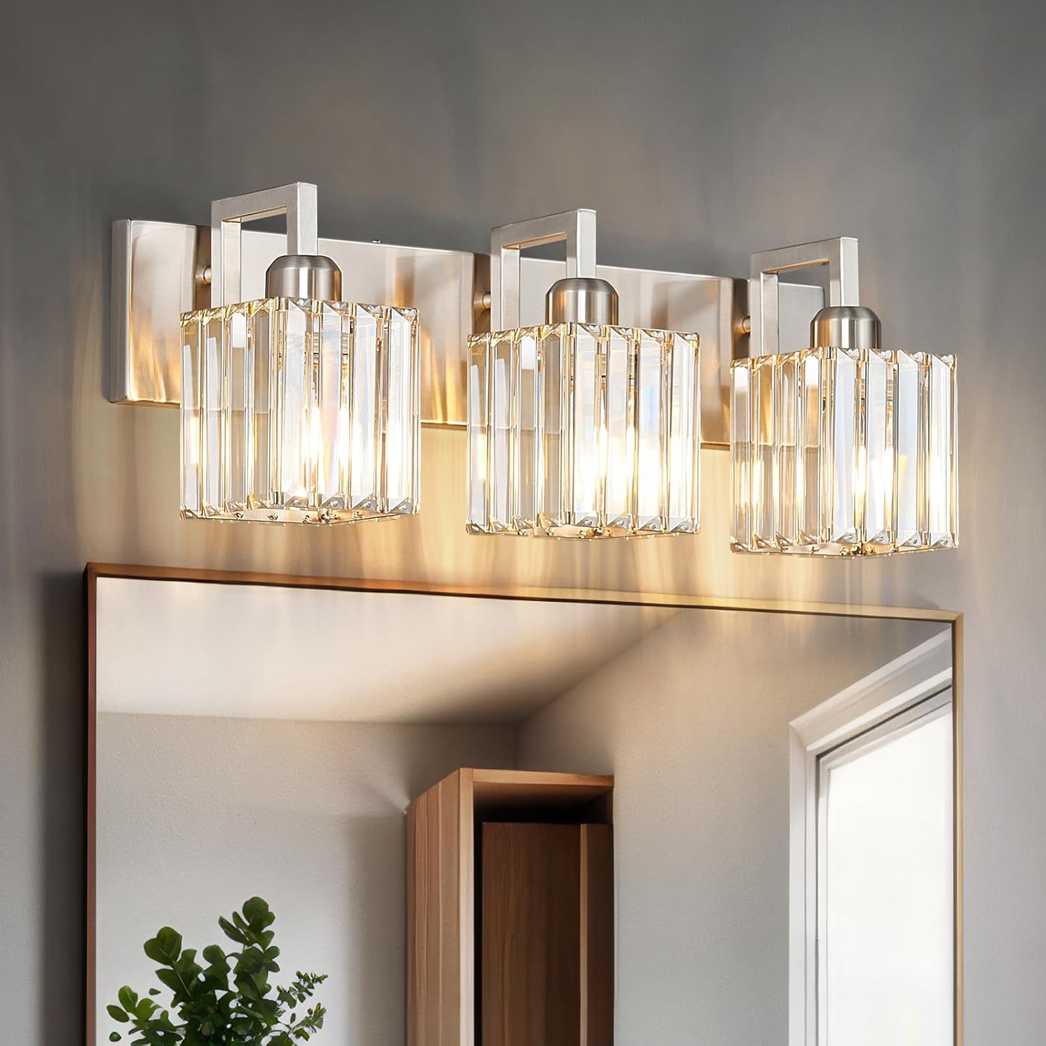 Modern Bathroom Vanity Light 3-Lights Brushed Nickel Vanity Light Crystal Wall Light Bathroom Light Fixtures