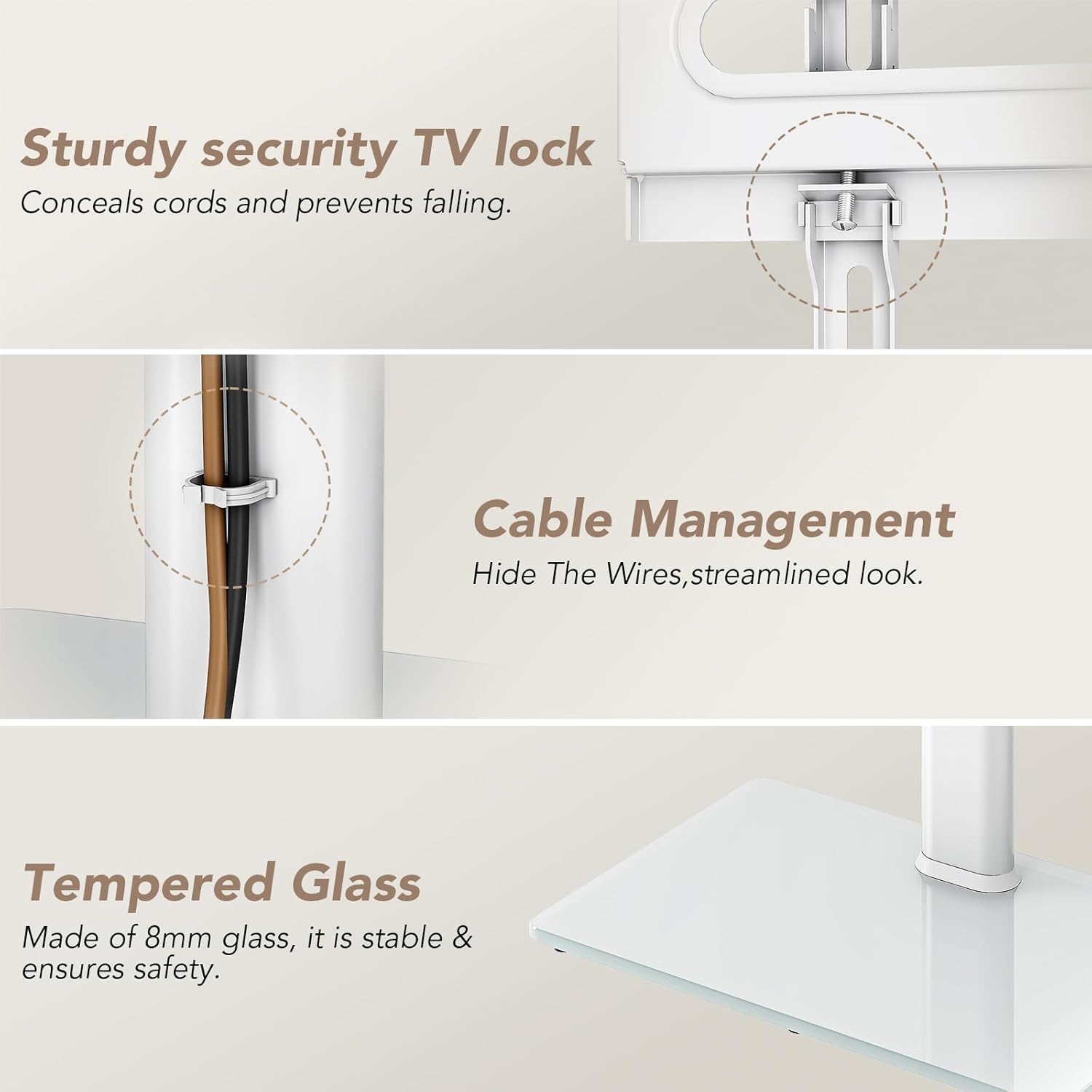 - SMART DESIGN ☞ This smart floor TV stand comes with 10mm solid tempered glass base that connects to a solid steel pillar which provides stable support for your TV that creates a modern look for your audio video equipment, it can hold up to 77lbs