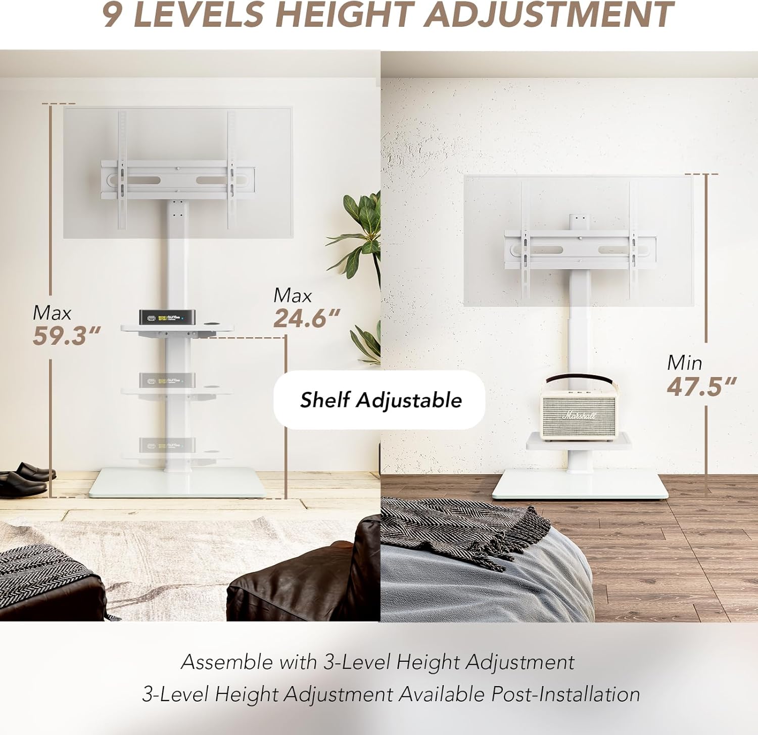 - MULTIFUNCTIONAL FLOOR TV STAND ☞ My functional TV mount have 4 level height adjustment in order to choose your best space, besides -35 to +35 degree swivel mount can choose the best viewing to catch TV entertainment