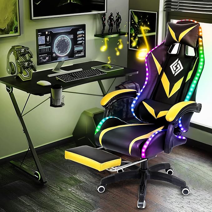 HOFFREE RGB Gaming Chair with Speakers and Massage Ergonomic Computer Chair with Lights and Footrest Reclining Video Game Chairs for Adults Yellow and Black