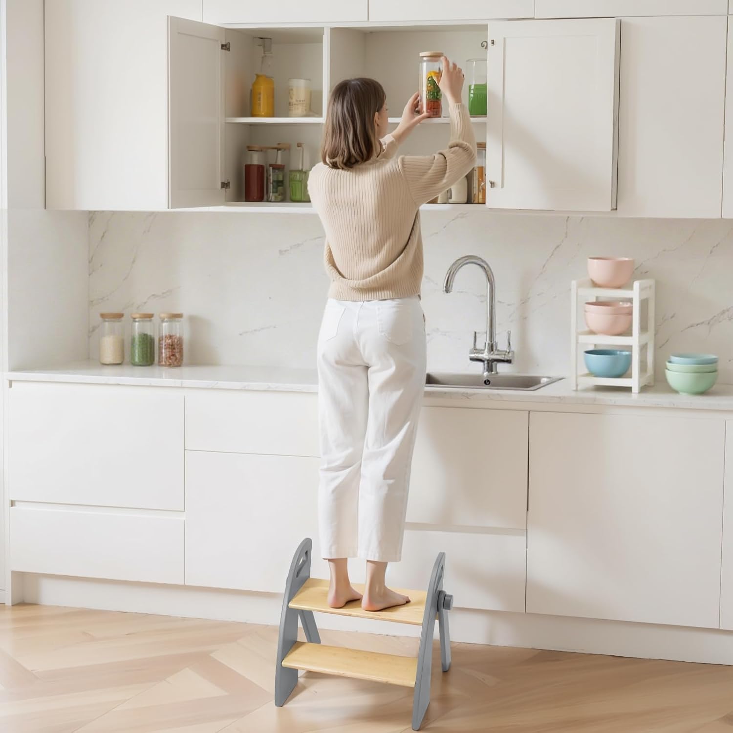 Wooden 2 Step Stool for Kids Bathroom Sink Foldable Anti-Slip 2-Step for Toilet Potty Training, Child Stepping Stool for Kitchen Nursery Bedroom, Sturdy Non Slip Adult Stool for Closet Grey