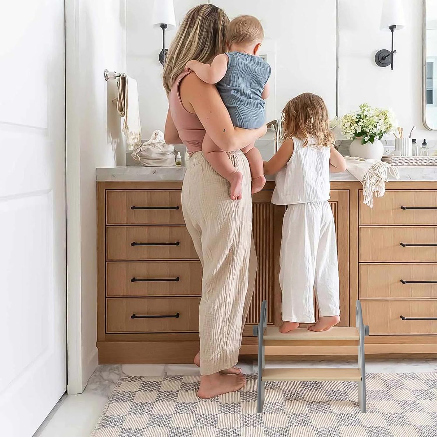 - ENSURE STABILITY AND PREVENT SLIPPAGE: A sliding, unstable step stool can pose a safety risk for children. That’s why this step stool is equipped with a crossbar and four non-slip pads, enhancing its sturdy structure and increasing friction between the stool and the floor. Whether used in the bathroom or kitchen, this design ensures the stool remains stable and slip-free.