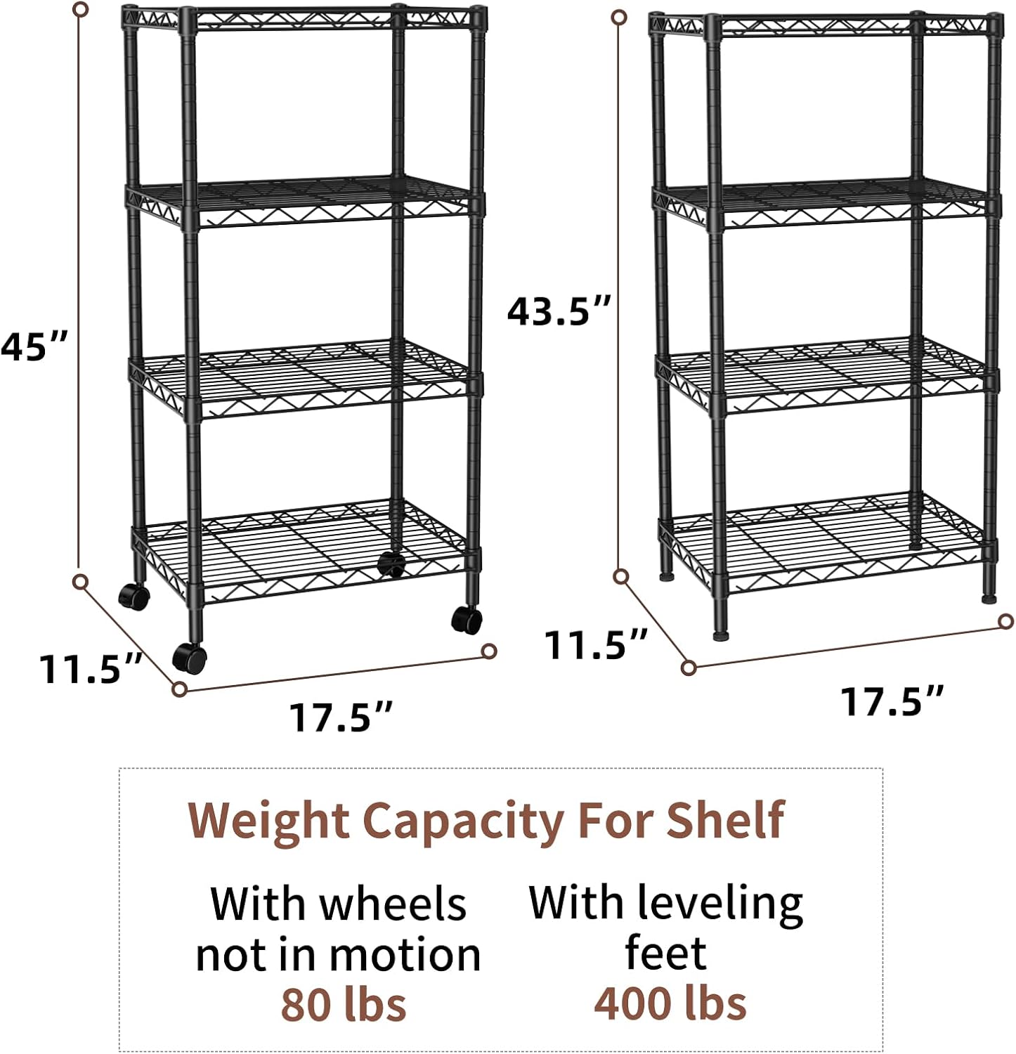 - Convenient Home Storage: Metal wire shelves with adjustable spacing (11.5”D X 17.5”W X 45” H) make perfect for narrow spaces or room corners such as kitchens, bathrooms, laundry rooms, balconies, garages, entries, or offices.