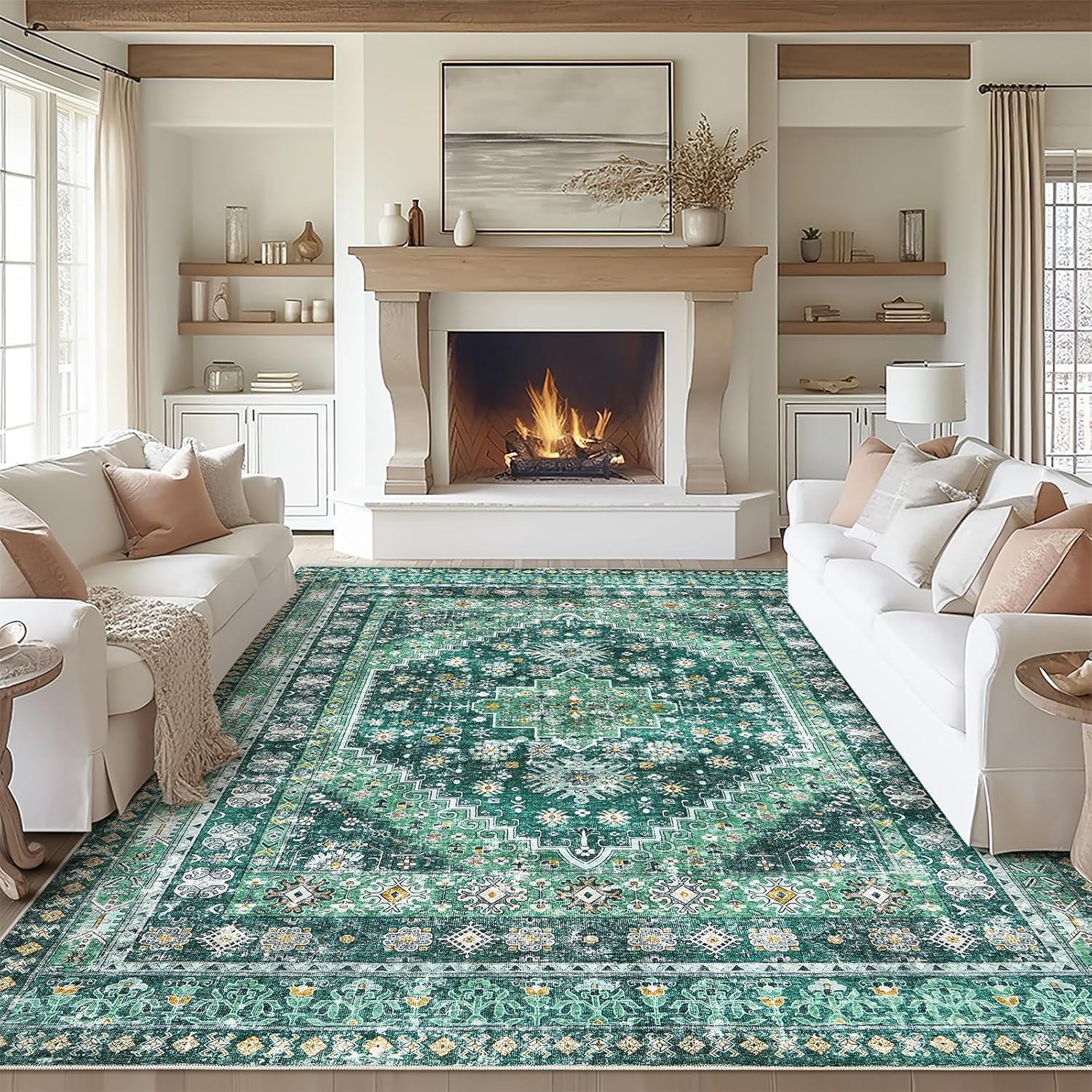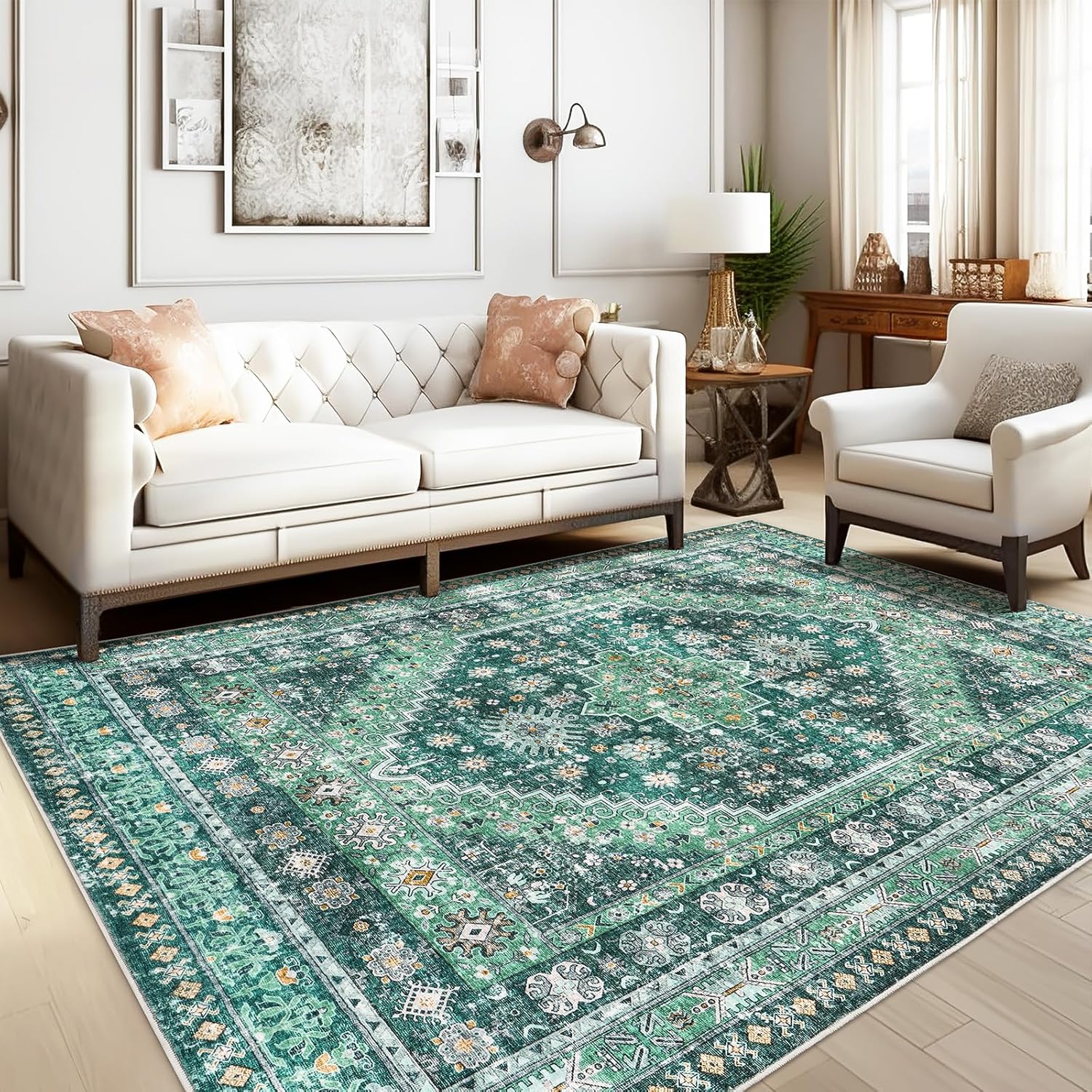 zesthome 8x10 Area Rugs for Living Room,Non-Slip Backing Washable Rugs,Vintage Large Area Rug,Stain Resistant Home Decor Rug(Green/Teal,8'x10')