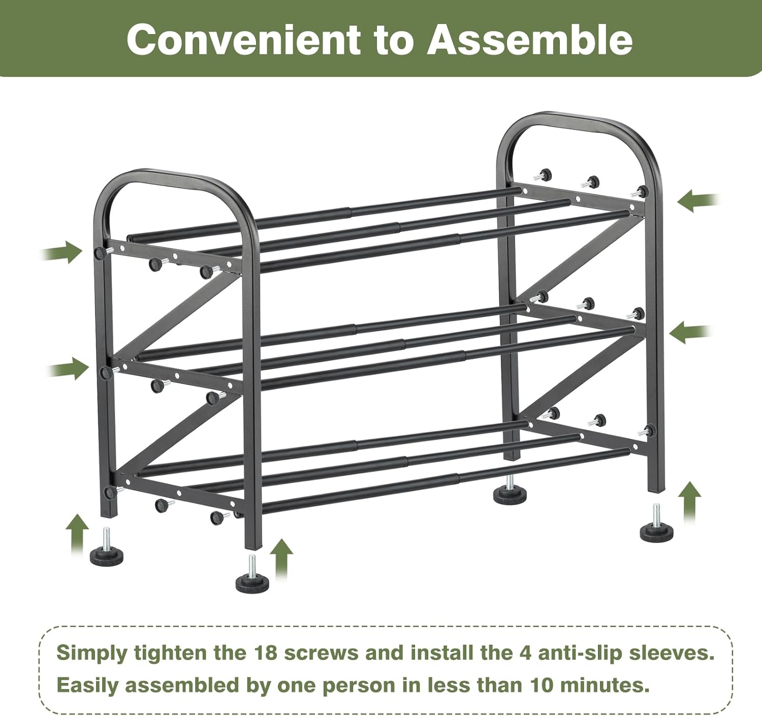 - Adjustable Shoe Rack with 5-Minute Assembly No tools required! Set up this sturdy shoe rack in under 5 minutes. Its simple design and numbered parts ensure hassle-free installation, perfect for busy households