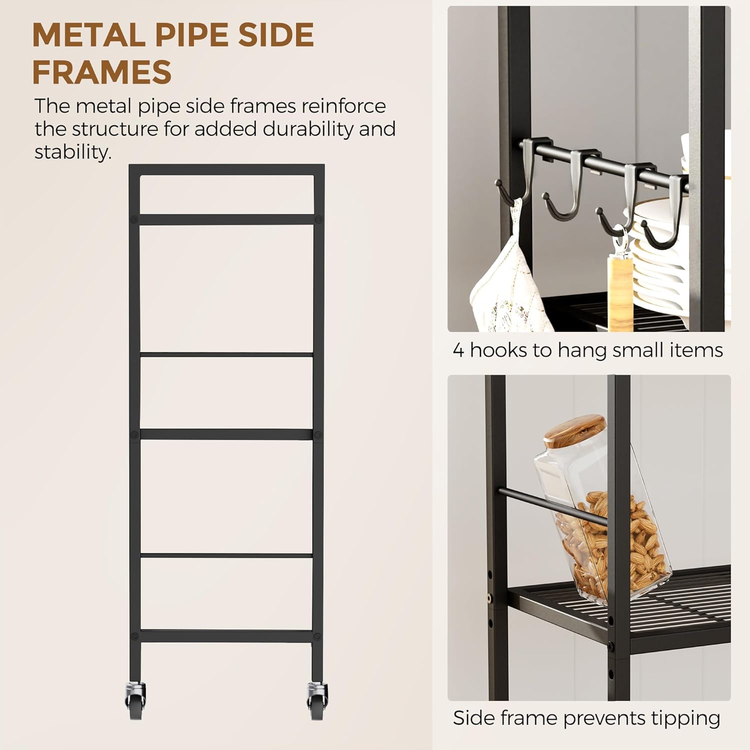 - ăMetal Pipe Side Frames & 4 HooksăThe metal pipe side frames help reinforce the structure, protect your items from falling off.It also includes 4 hooks, ideal for hanging small utensils like mugs, cooking spoons, dish towels, baking gloves, or whisks.