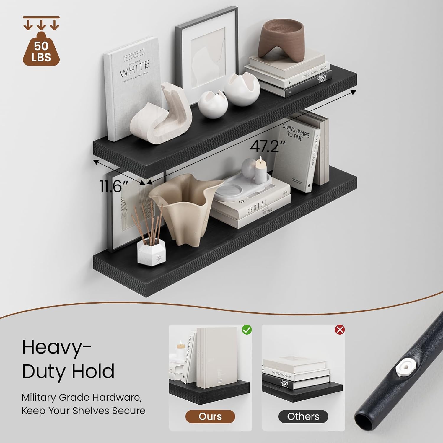 Heimlove 48W x 12D Long Floating Shelf, 12 Inch Deep Black Floating Shelves for Wall Set of 2, Wood Shelves for Bedroom Living Room Bathroom Kitchen Home Office, Wall Shelves with Heavy Duty Bracket