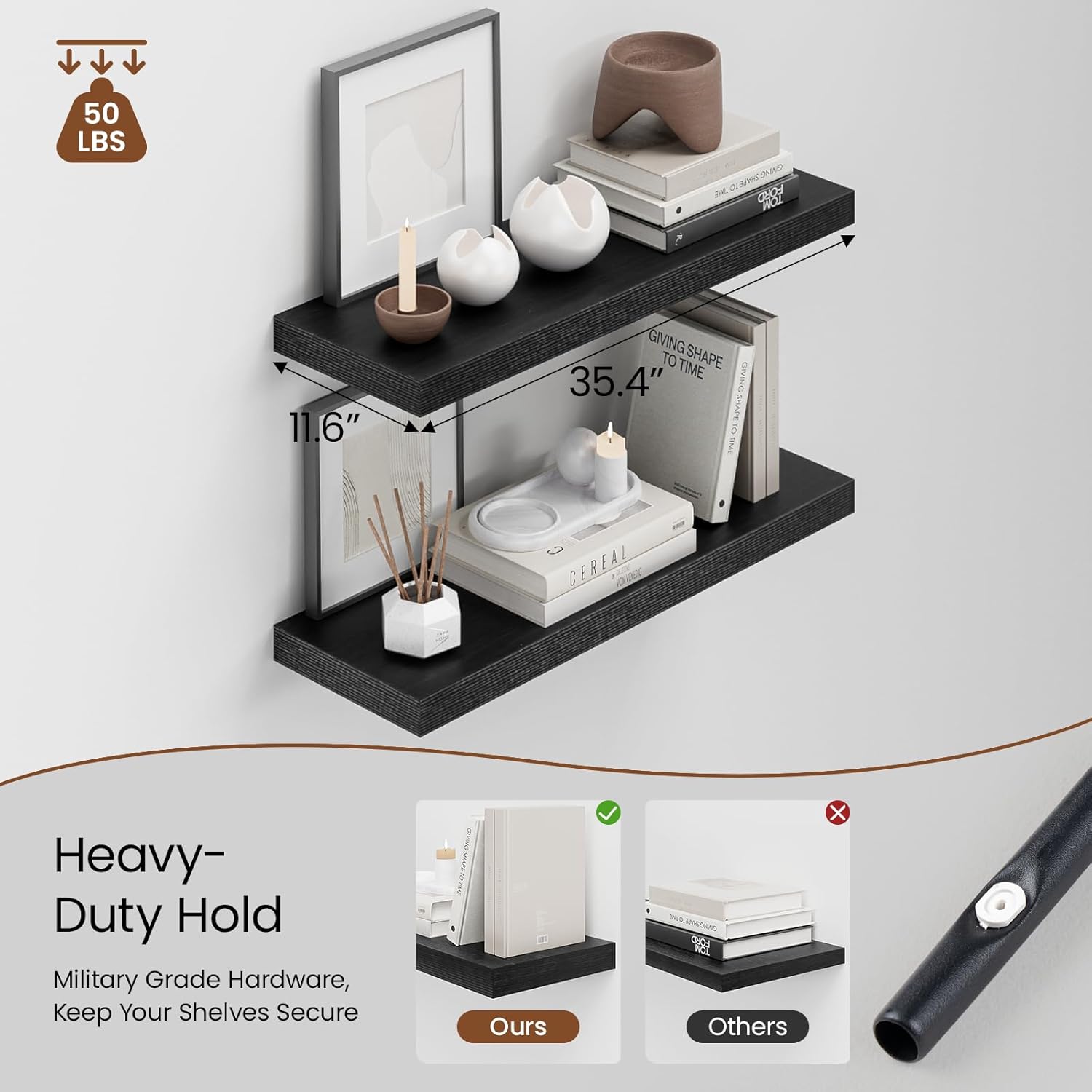 - Extra Deep Floating Shelves: Measuring 11.6” D x 35.4” W x 1.5” H, these shelves are crafted for maximum depth and durability. The spacious 12” depth gives you plenty of room for stylish display, organized storage, and decorative accents. Perfectly suited for your bathroom, kitchen, or living room, they enhance both function and flair in any space!