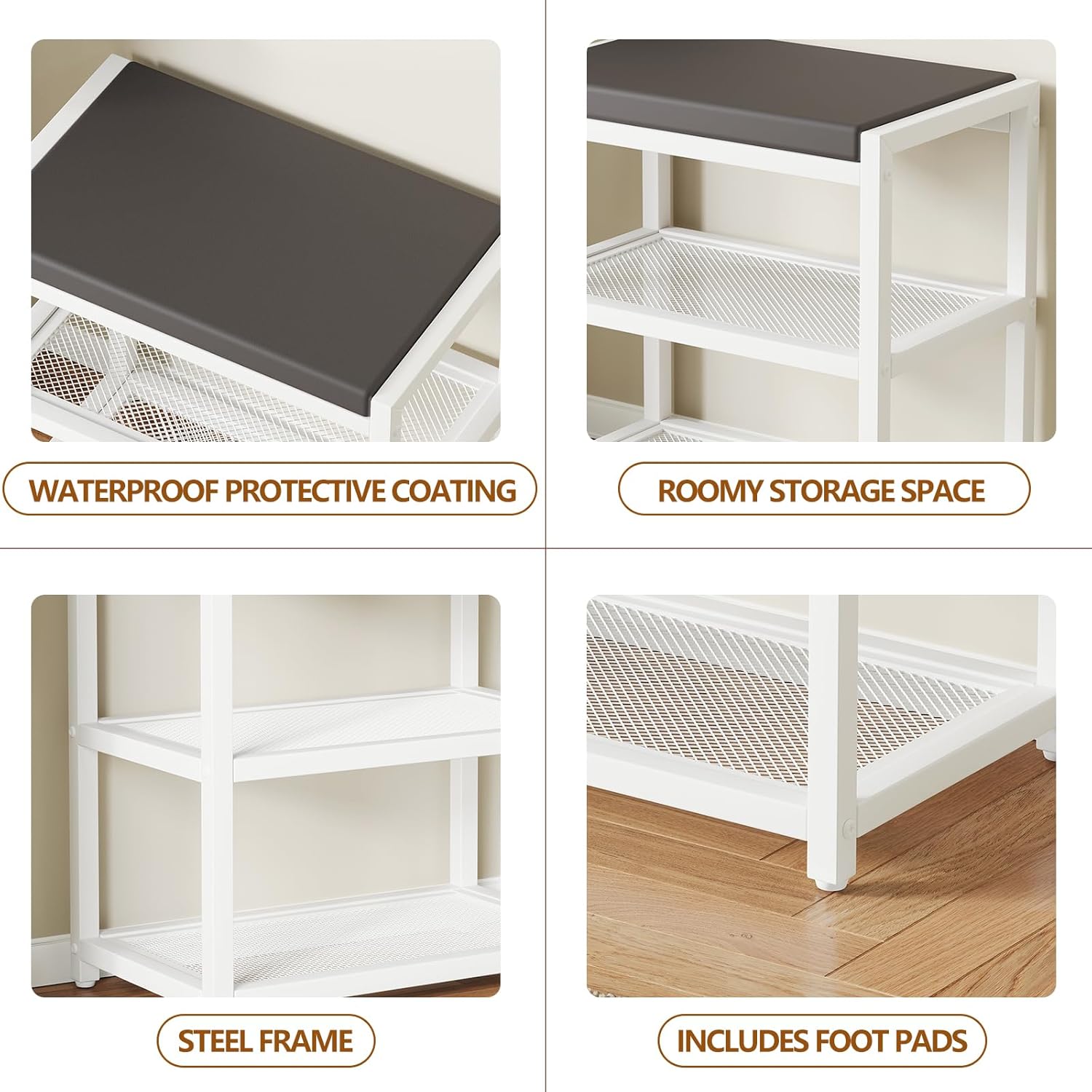 - Strong Support: This shoe rack bench is built with a robust powder-coated steel frame, offering firm and reliable support. Say goodbye to hard, stone-like stools and try our comfortable Small Shoe Bench! It not only provides durability but also has a maximum static load of 300 lb, making it a strong seating option for your needs.