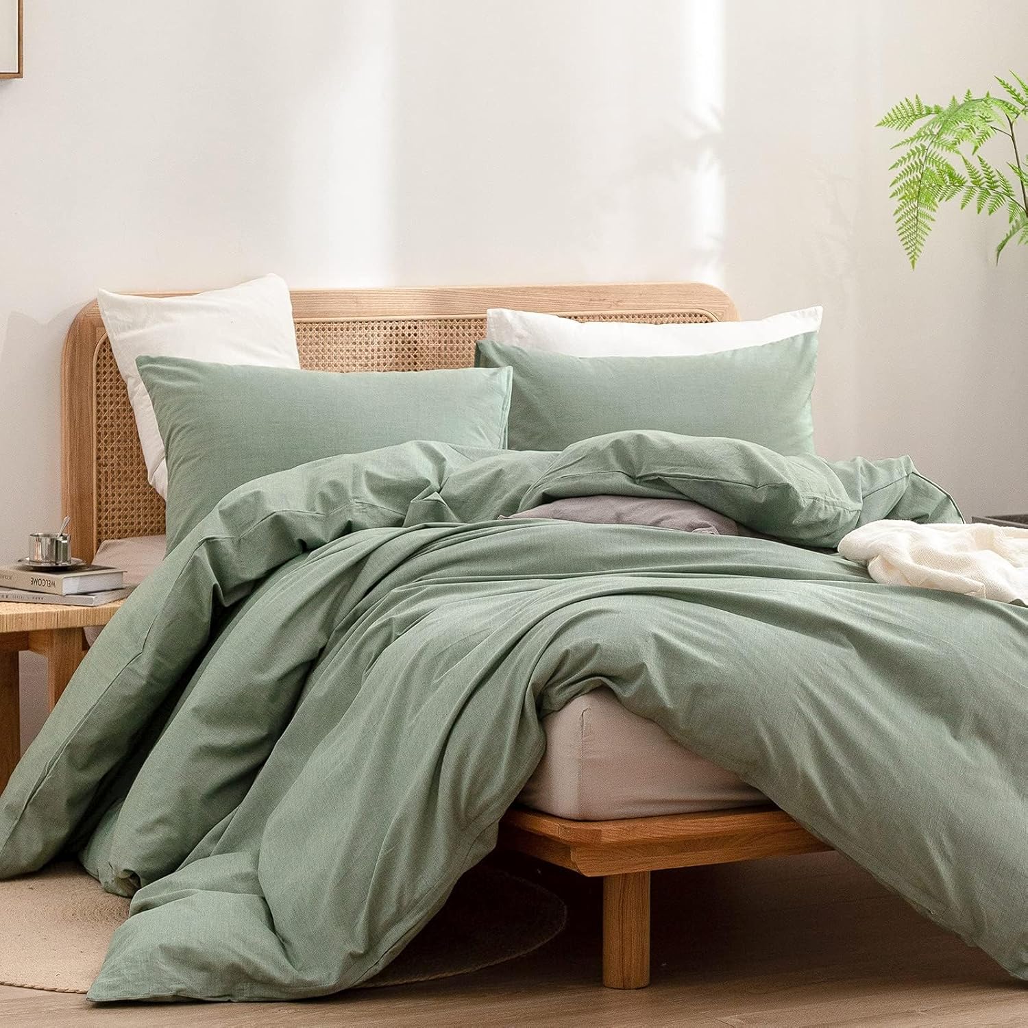 BESTOUCH Duvet Cover Set 100% Washed Cotton Linen Feel Super Soft Comfortable Chic Lightweight 3 PCs Home Bedding Set Solid Green Super King Plus