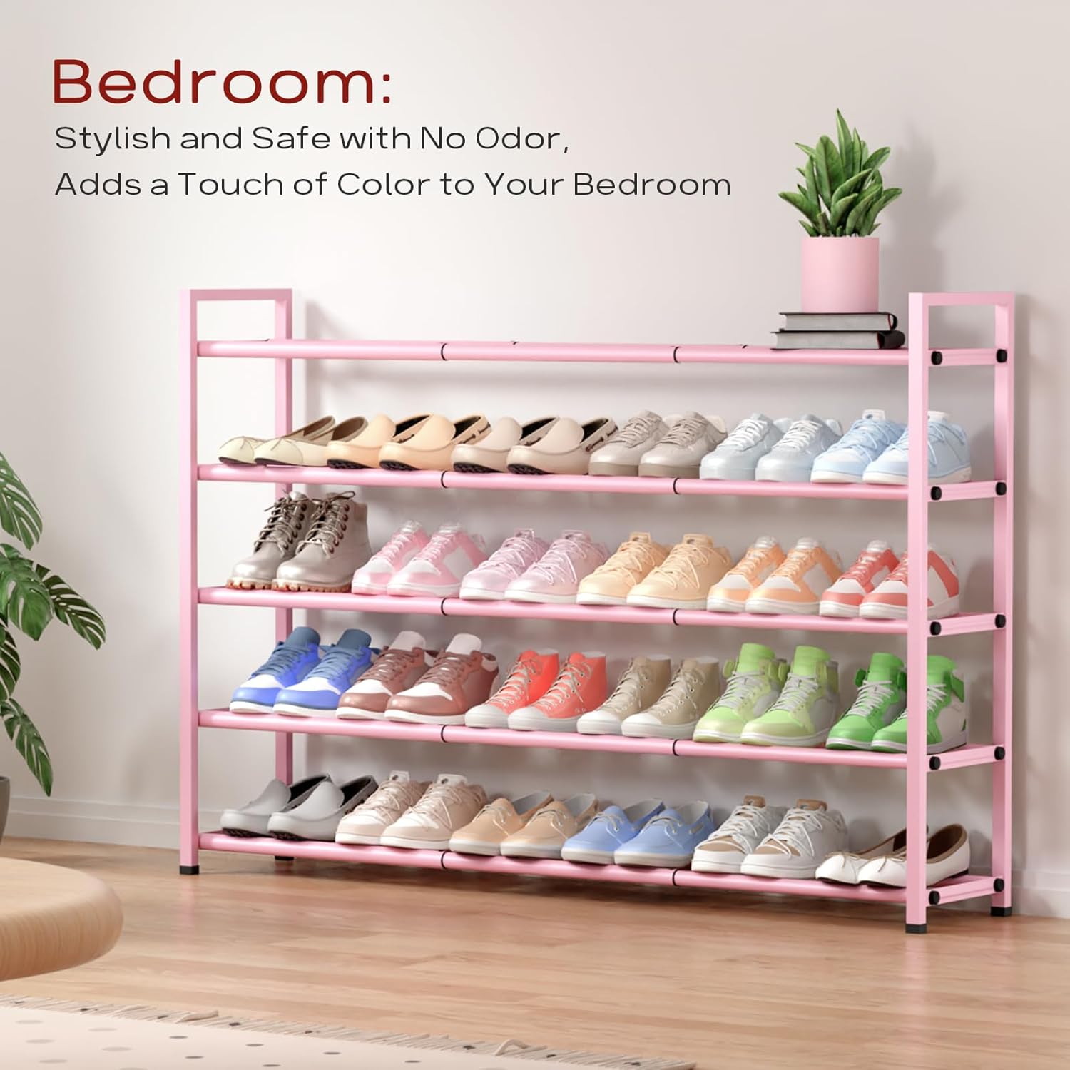 Bumusty 5-Tier Long Expandable Shoe Rack for Closet, 18"-44" Adjustable Shoe Rack for Entryway, 25-30 Pairs Large Shoe Organizer Shelf Storage, Sturdy Metal, Pink