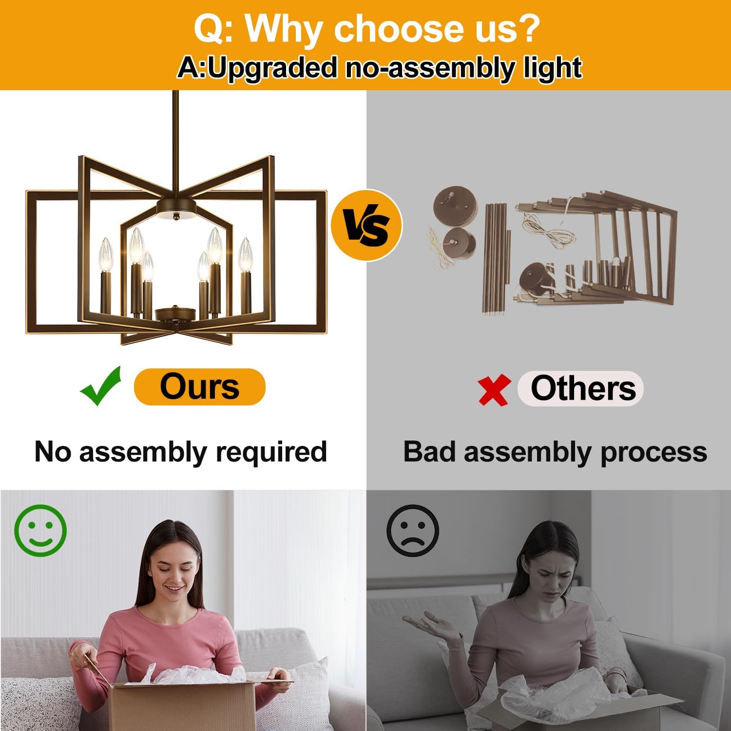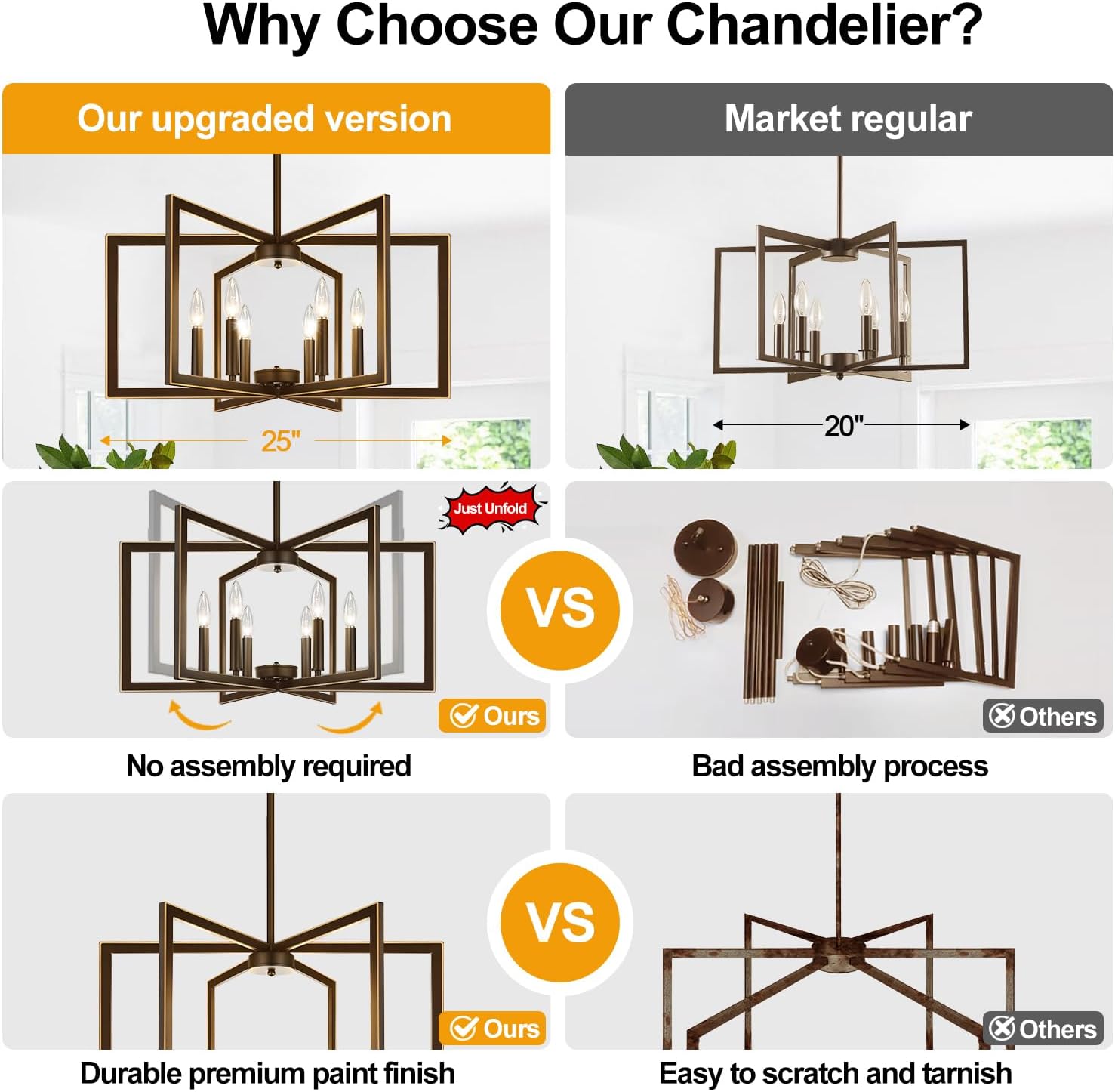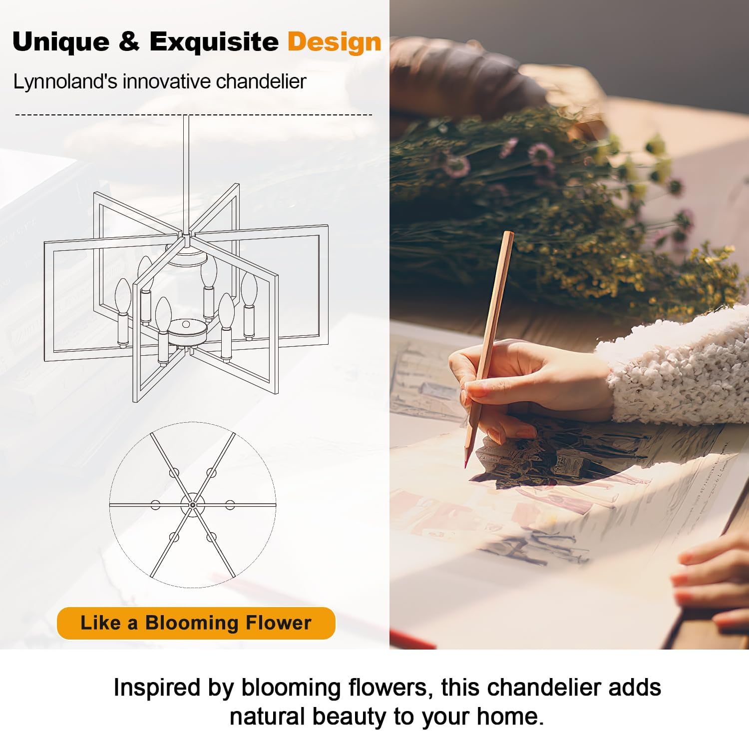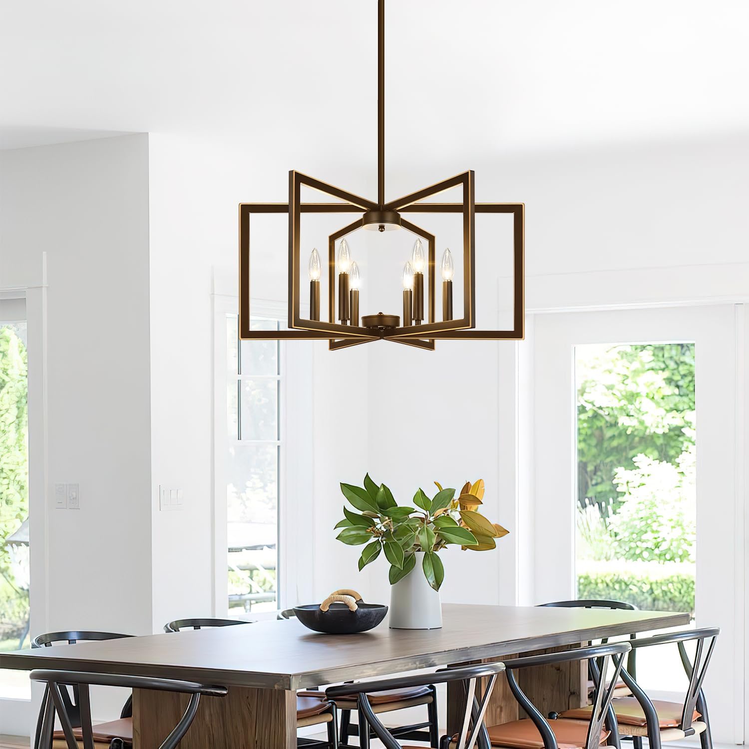 - 【Style & Design】This modern chandelier features 6 geometric square metal frames, each with a lamp holder. The clean, minimalist design creates a modern look, and when the frames are unfolded, it resembles a blooming flower, adding a touch of elegance to any space such as the kitchen island, living room, foyer, dining table, entryway, bedroom, farmhouse, and office.