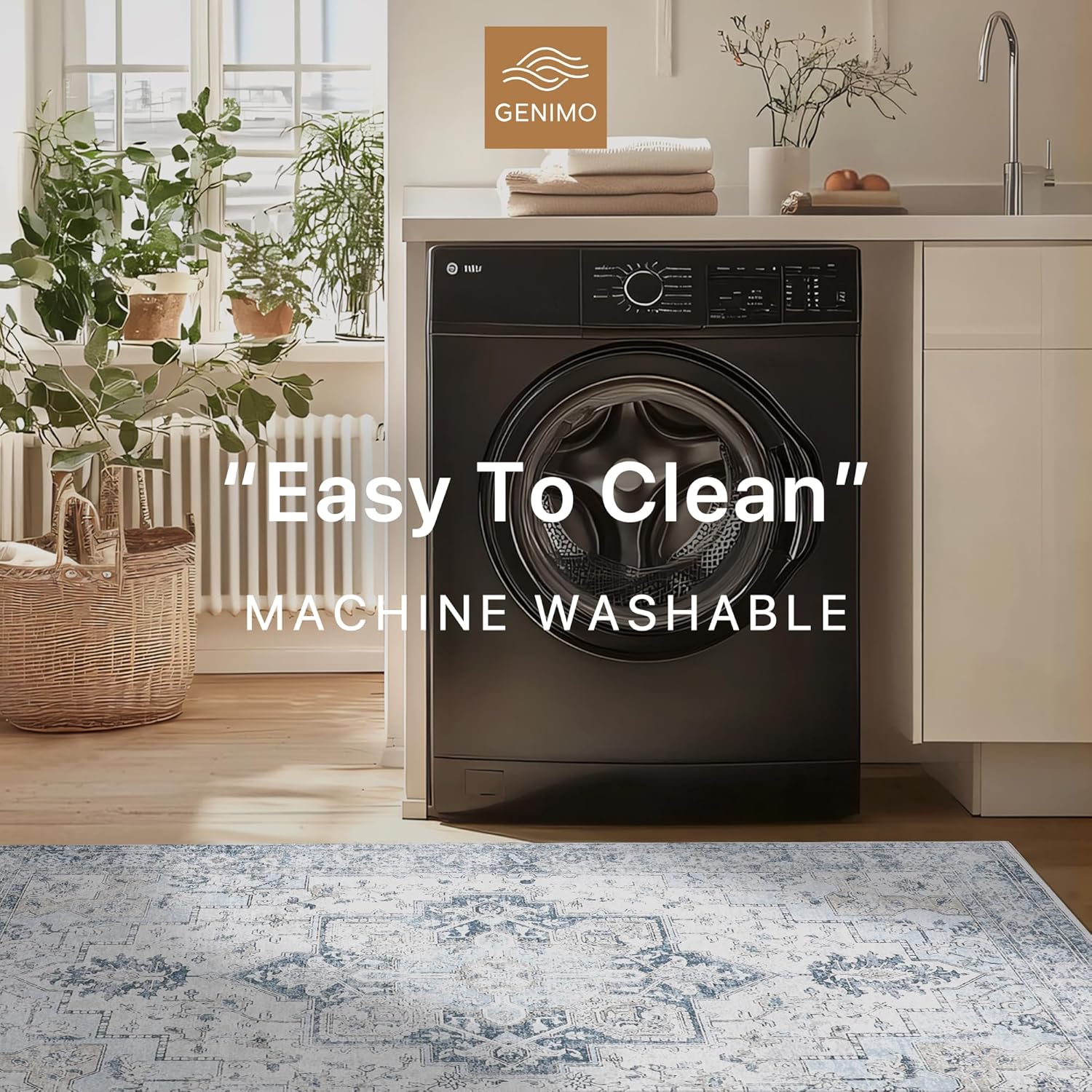GENIMO 7'6''x9'6'' Area Rugs for Living Room, Machine Washable Non Slip Vintage Rugs, Low Pile Lightweight Chenille Print Rug for Bedroom, Dining Room, Home Office, Blue