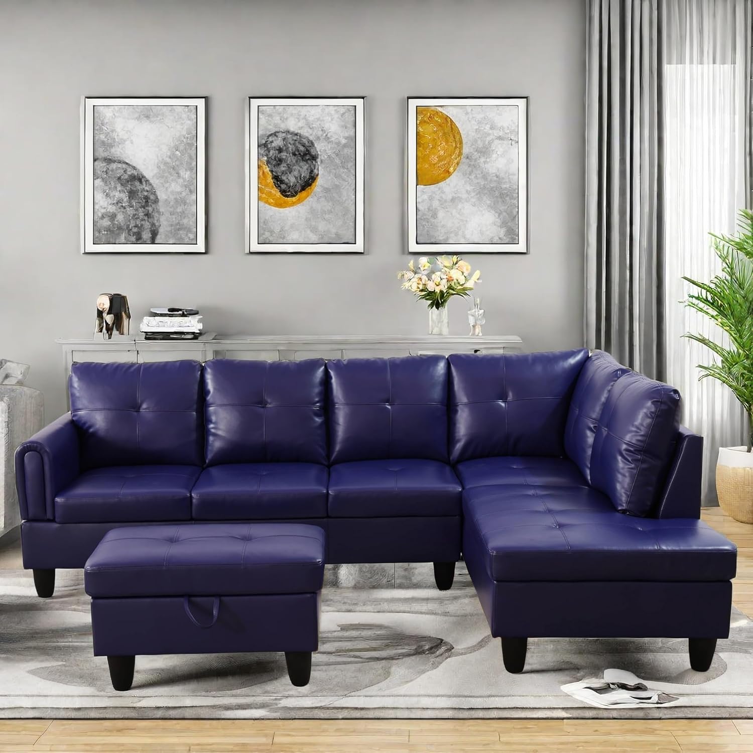 Convertible Leather Sectional Couch, Modern L Shaped Couch with Storage, Large Modular 5-Seat Sectional Sofa with Ottomans for Living Room and Office, Dark Blue-Violet