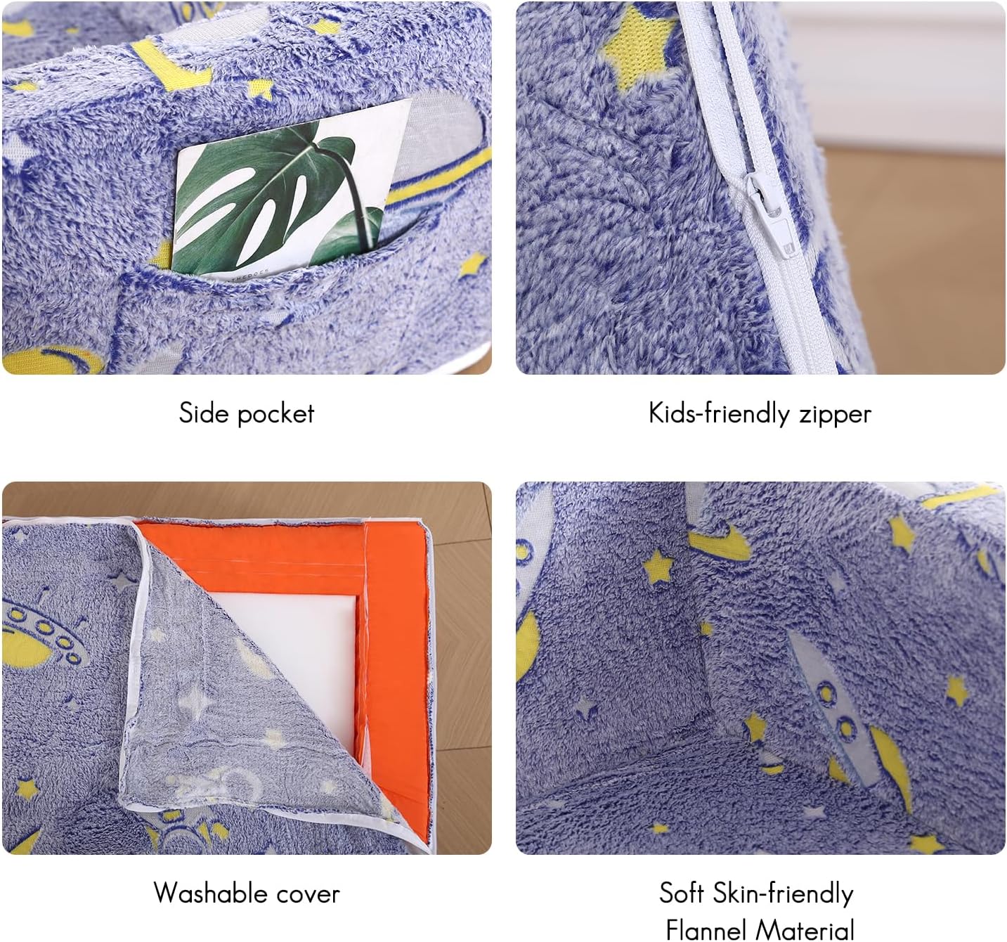 - Glow-in-the-Dark Design:The glowing pattern on this mini couch for kids not only catches children’s attention but also stimulates their curiosity about the universe. This unique design doubles as functional decor, providing a fluorescent effect in low-light settings like bedrooms or playrooms. Whether used in a nursery, daycare, preschool, or during family outdoor adventures like RV travel and camping, this kids pull-out couch is both stylish and versatile.