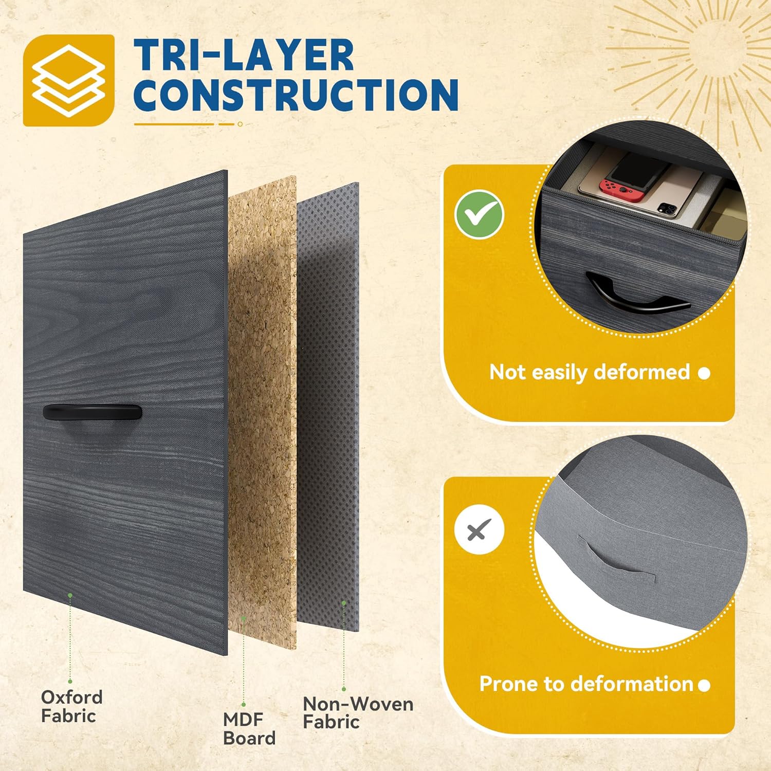 - ROOMY DRAWERS- 4 deep foldable drawers are spacious enough to hold your clothes and daily necessities; Large wooden top is great for showcasing your lamps, clocks, glasses, photos, etc.