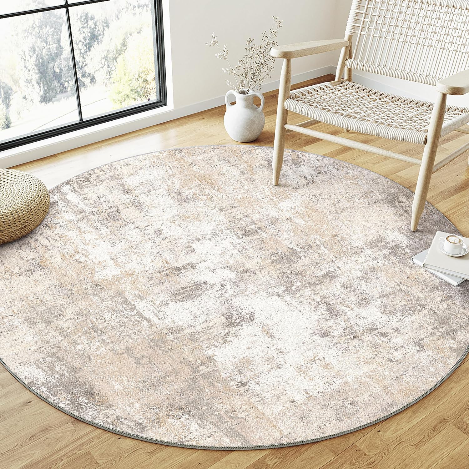 5x5 Washable Round Rug Beige Grey Neutral Abstract Living Room Bedroom Non Slip Low Pile Area Rug Office Entryway Indoor Doormat Soft Carpet for Entrance Bathroom Kitchen