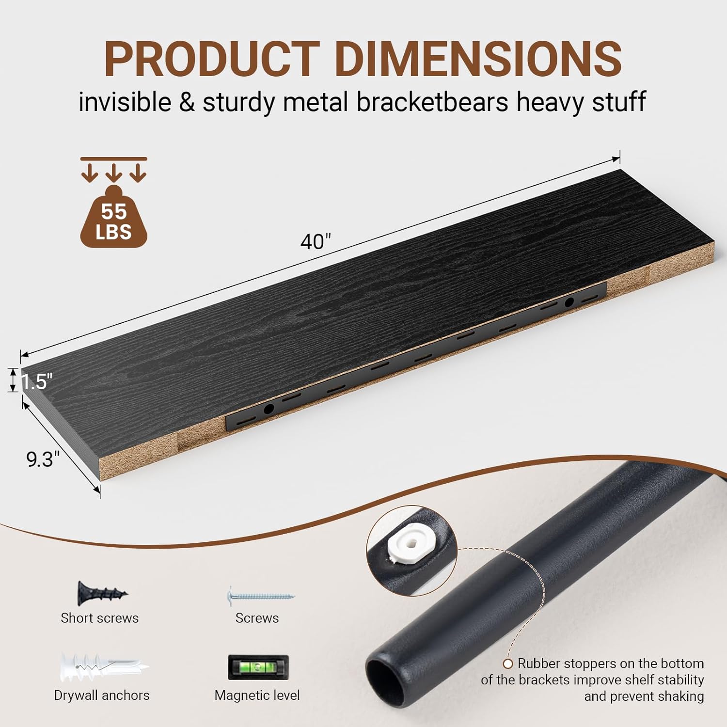 - ăSturdy & Reliable MaterialăThe black shelves for wall use metal brackets and screws to be firmly fixed to the wall without sagging.Our 40 inch floating shelf are made of high quality MDF material,can hold up to 55 lbs to safely place your items.