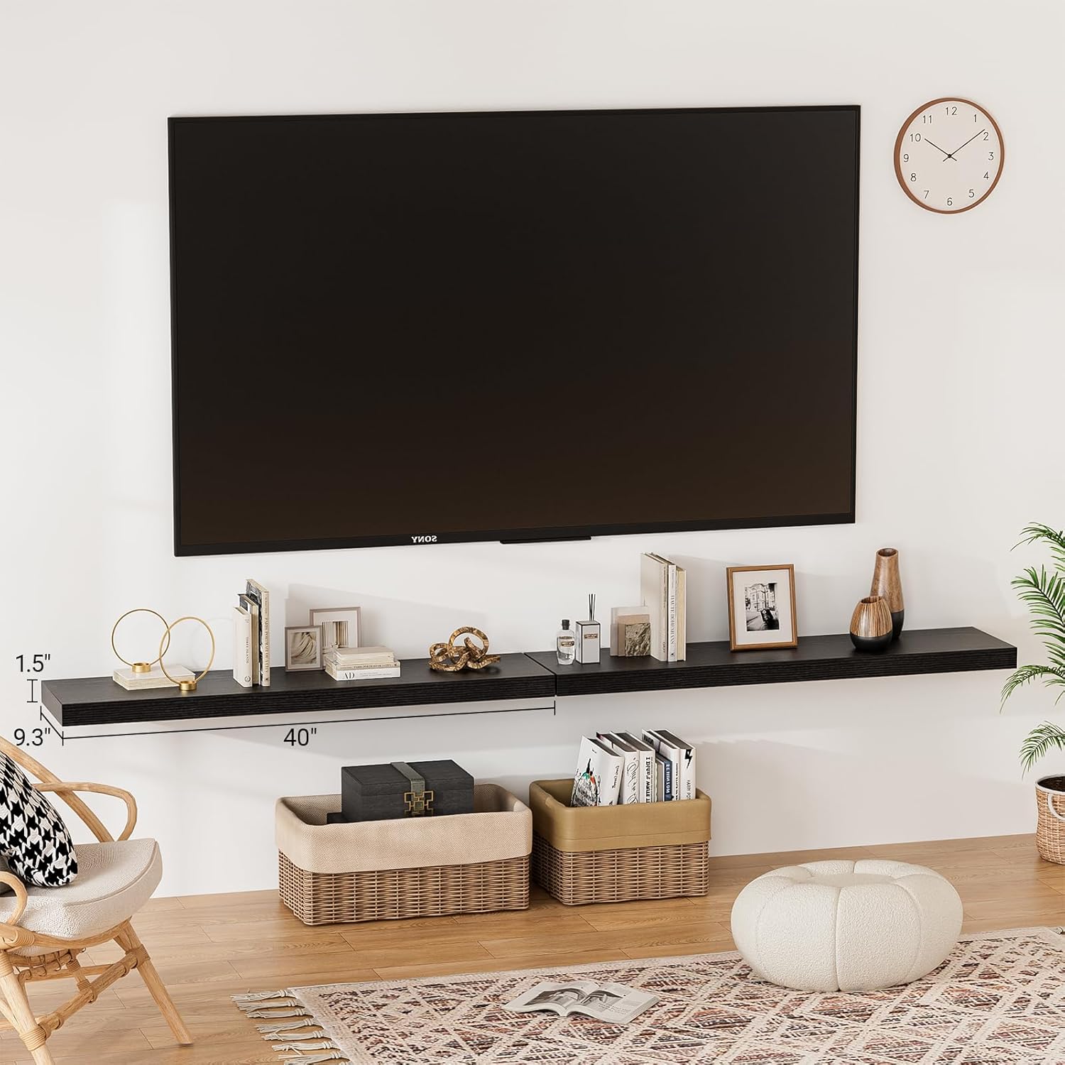 - ăLonger DesignăOur pretty black wall shelves are 40"W x 9.3"D x 1.5"H.Our black floating shelves is longer than traditional designs and can hold more items.The black floating shelf optimize wall space,helping organize essentials without taking up floor space in your home.