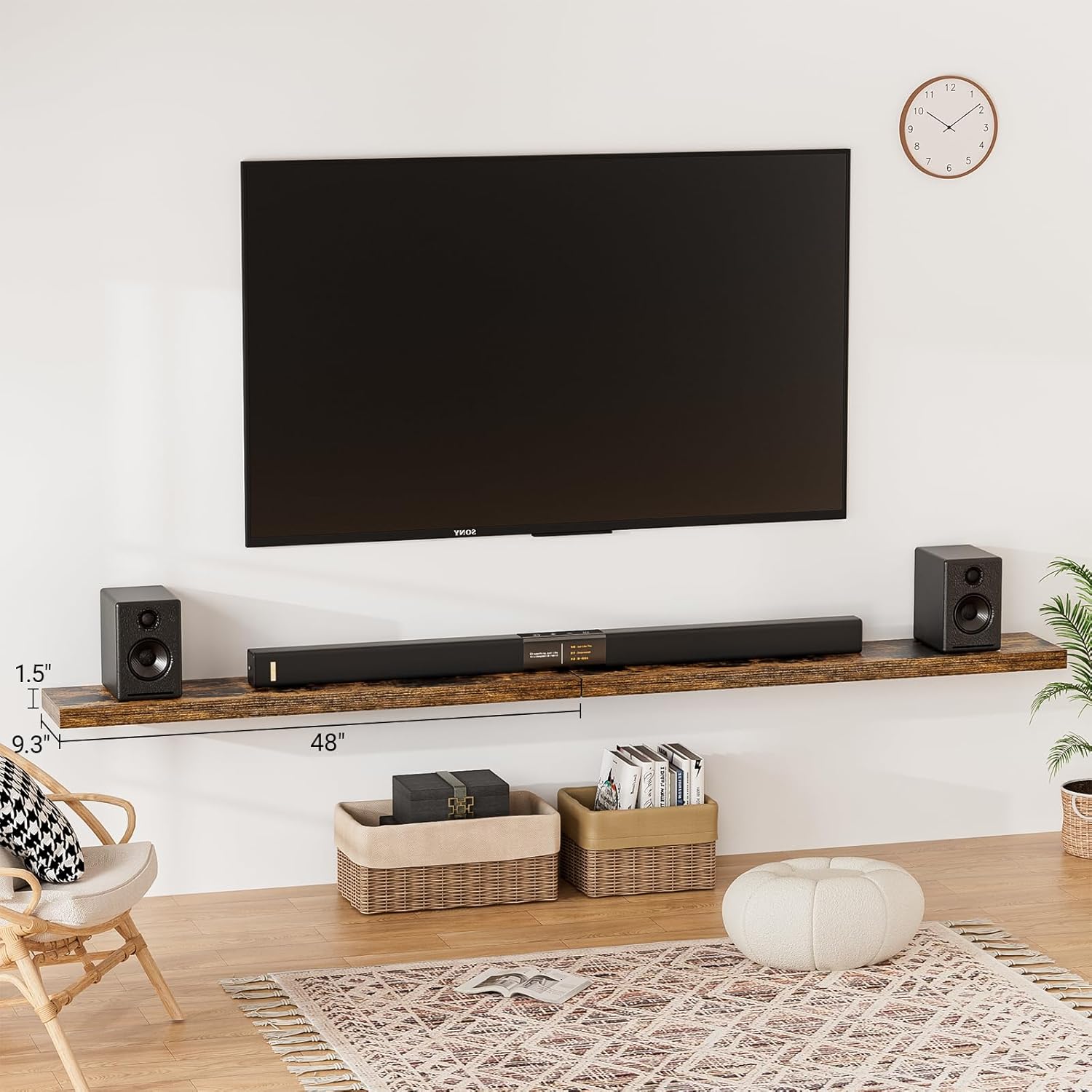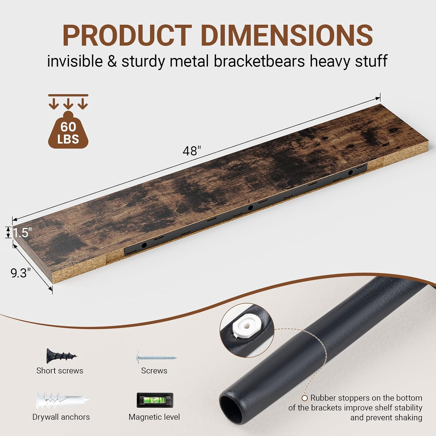 - ăLonger DesignăOur pretty wall shelves are 48"W x 9.3"D x 1.5"H.Our brown floating shelves is longer than traditional designs and can hold more items.The rustic brown floating shelves optimize wall space,helping organize essentials without taking up floor space in your home.