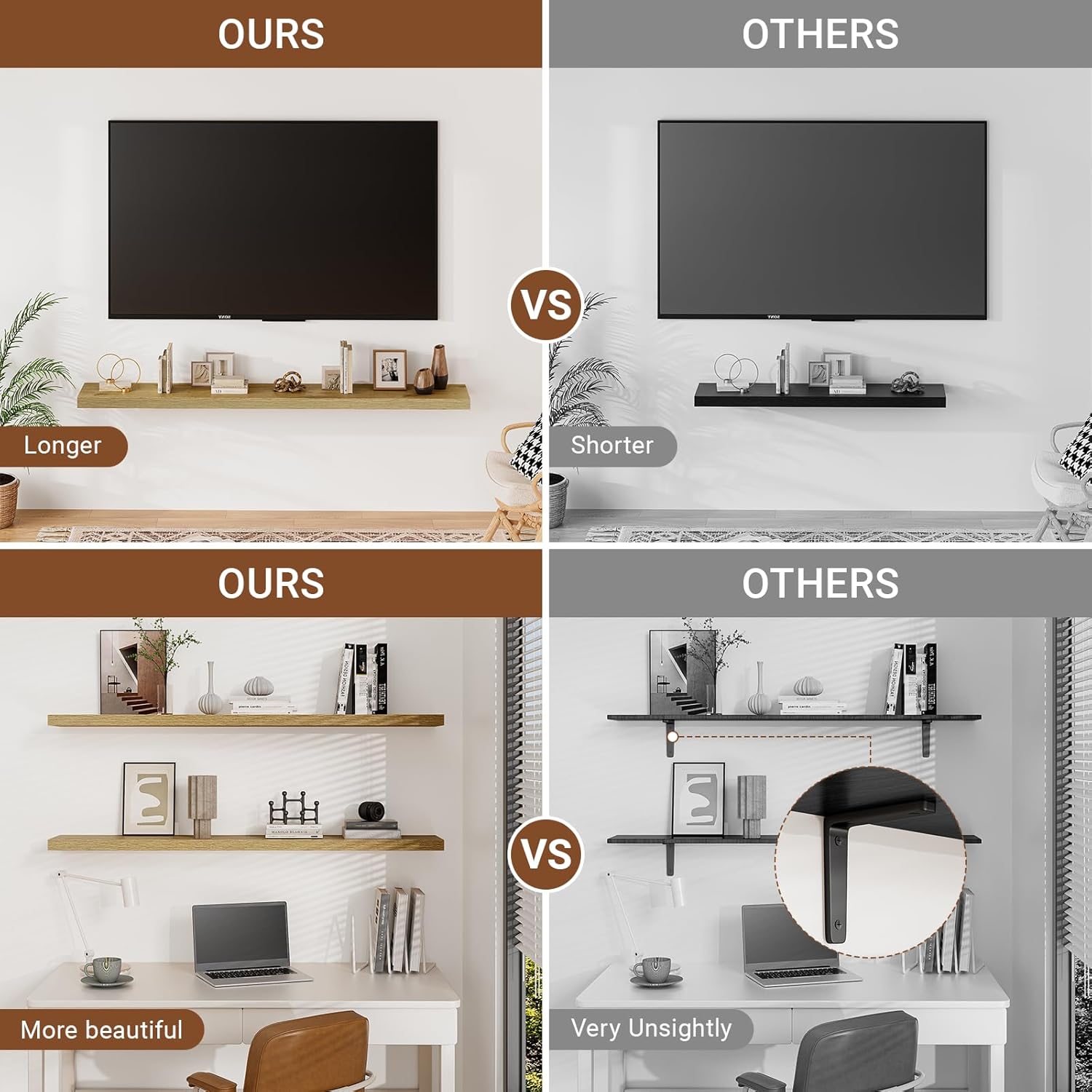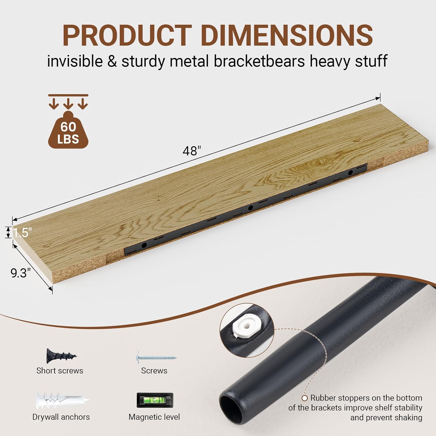 - ăSturdy & Reliable MaterialăThe floating shelves 48 inches long use metal brackets and screws to be firmly fixed to the wall without sagging.Our wall shelves are made of high quality MDF material,can hold up to 60 lbs to safely place your items.