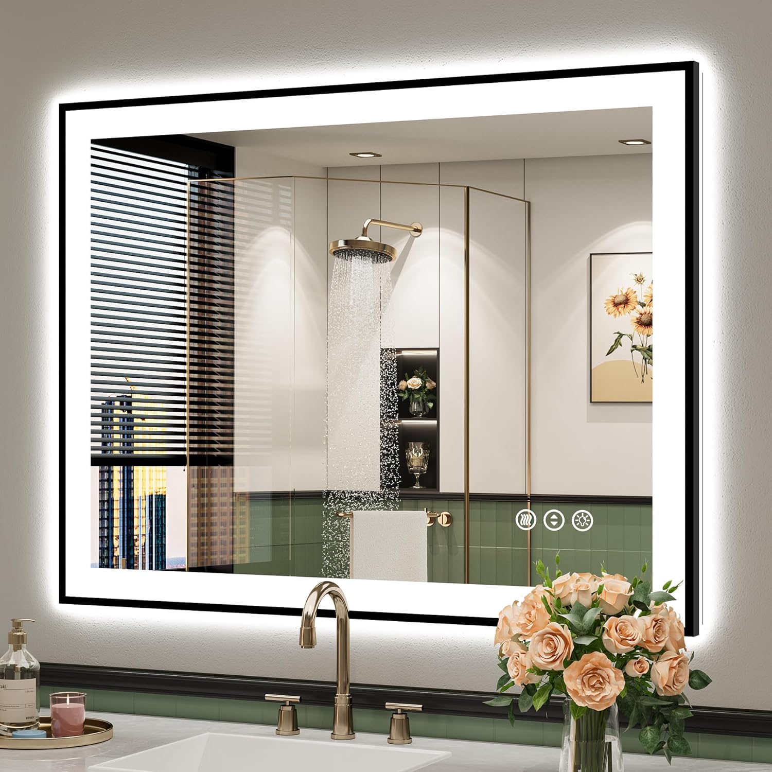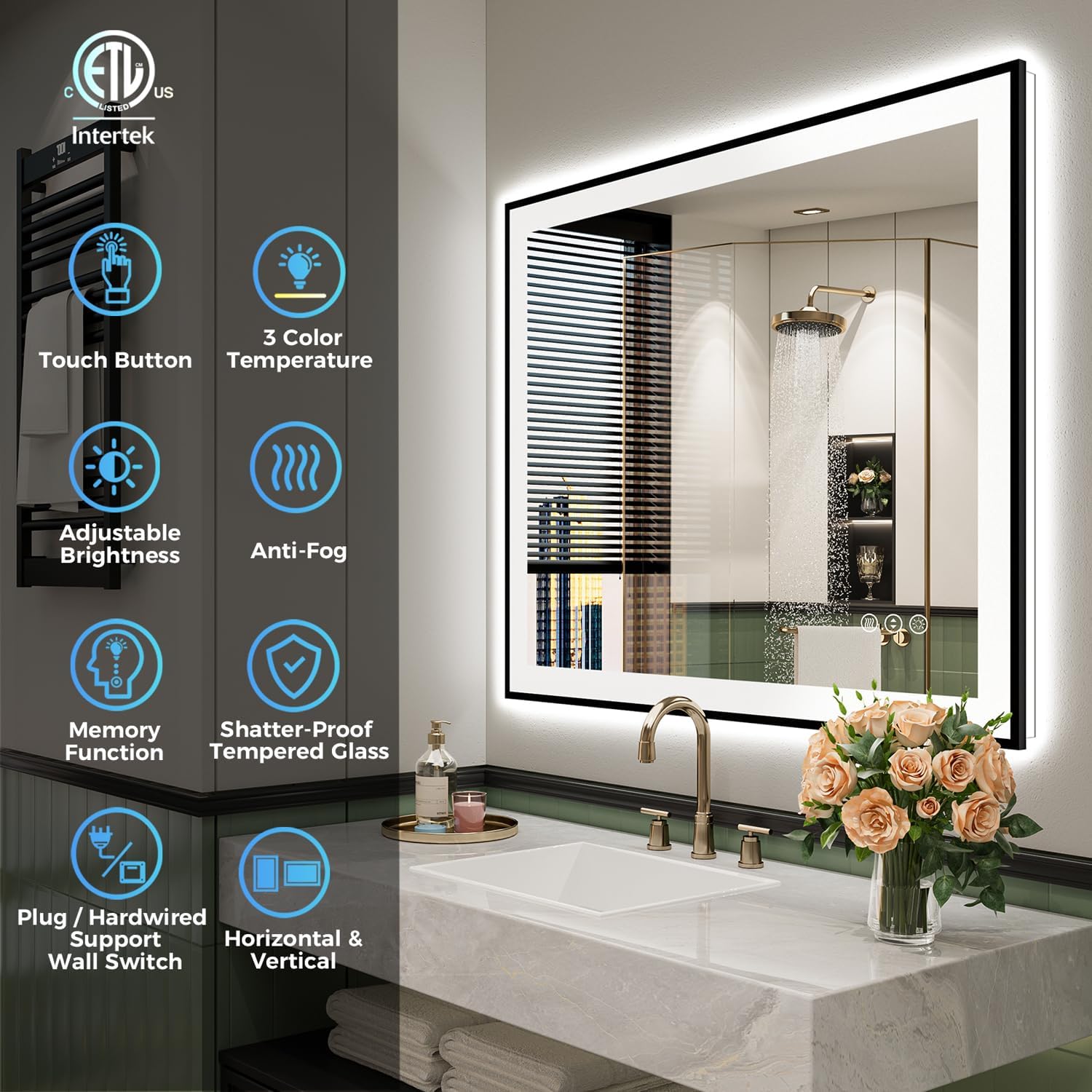40x30 Inch LED Bathroom Mirror with Lights (Front Lit and Backlit) Black Framed Lighted Vanity Mirror for Bathroom Wall Dimmable Anti-Fog Memory Tempered Glass Horizontal/Vertical