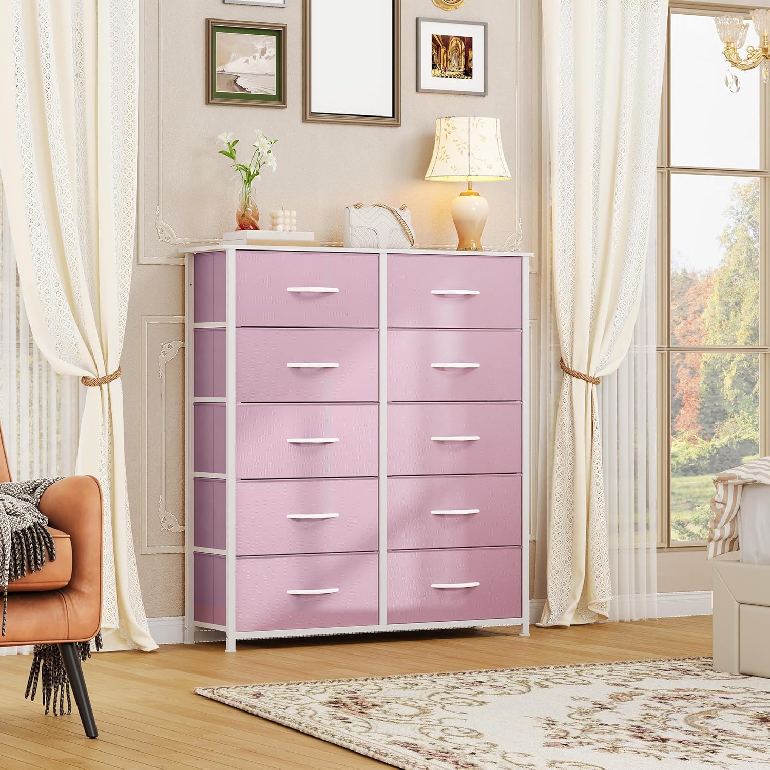 DWVO 10 Drawer Dresser - Fabric Storage Tower, Tall Chest Organizer Unit, Living Room, Hallway, Closets - Sturdy Steel Frame, Wooden Top & Easy Pull Fabric Bins, Pink