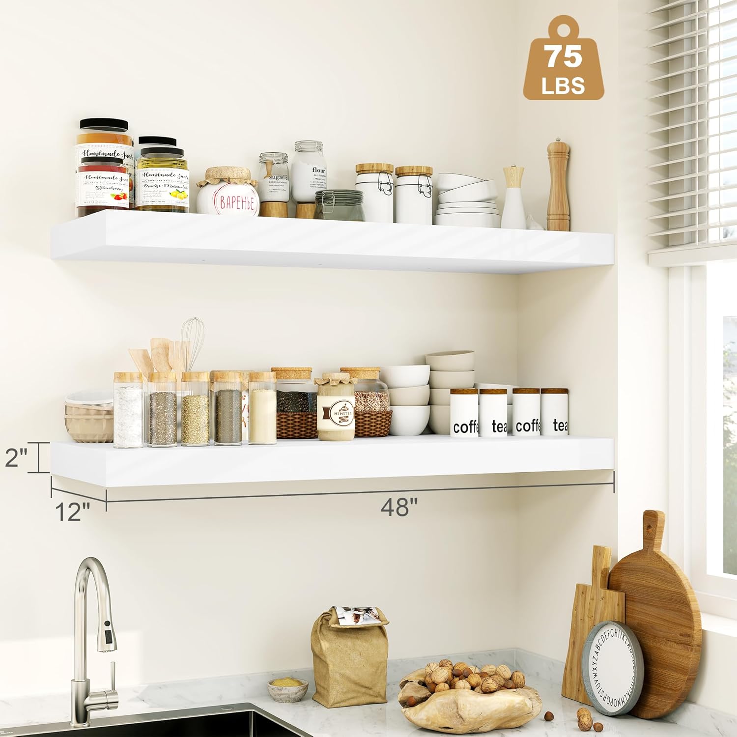 - 12 Inches Deep Floating Shelves :This extra deeper and thicker wall shelves are 48"L x 12"D x 2" H,with a capacity of 75Lbs. Our shelves for wall decor create a variety of storage spaces to organize small items on your desktop or counter.and they blend seamlessly with the rest of other decor and provide a stylish way to organize and display items.