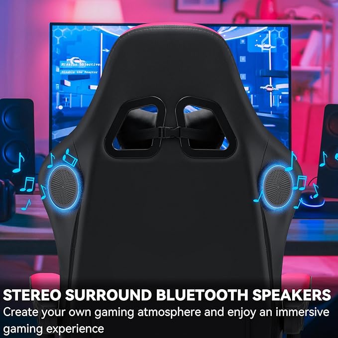 - 【5.3 Bluetooth Gaming Chair】Gaming Chair designed with dual bluetooth 5.3 speakers,the surround sound system brings you the best atmosphere in your entertainment, delivering superior and rich stereo effects with clear treble. Quickly connect to your smartphone, tablet, or other bluetooth-enabled device.