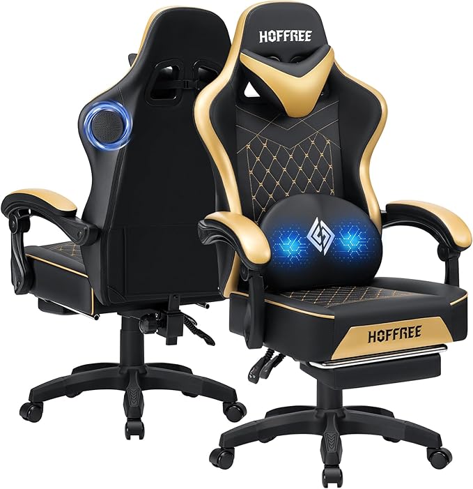 HOFFREE Gaming Chair with Speakers Massage Computer Gaming Chair with Pocket Spring Cushion for Adults Reclining Gamer Chair with Bluetooth Video Game Chairs with Footrest Gold and Black