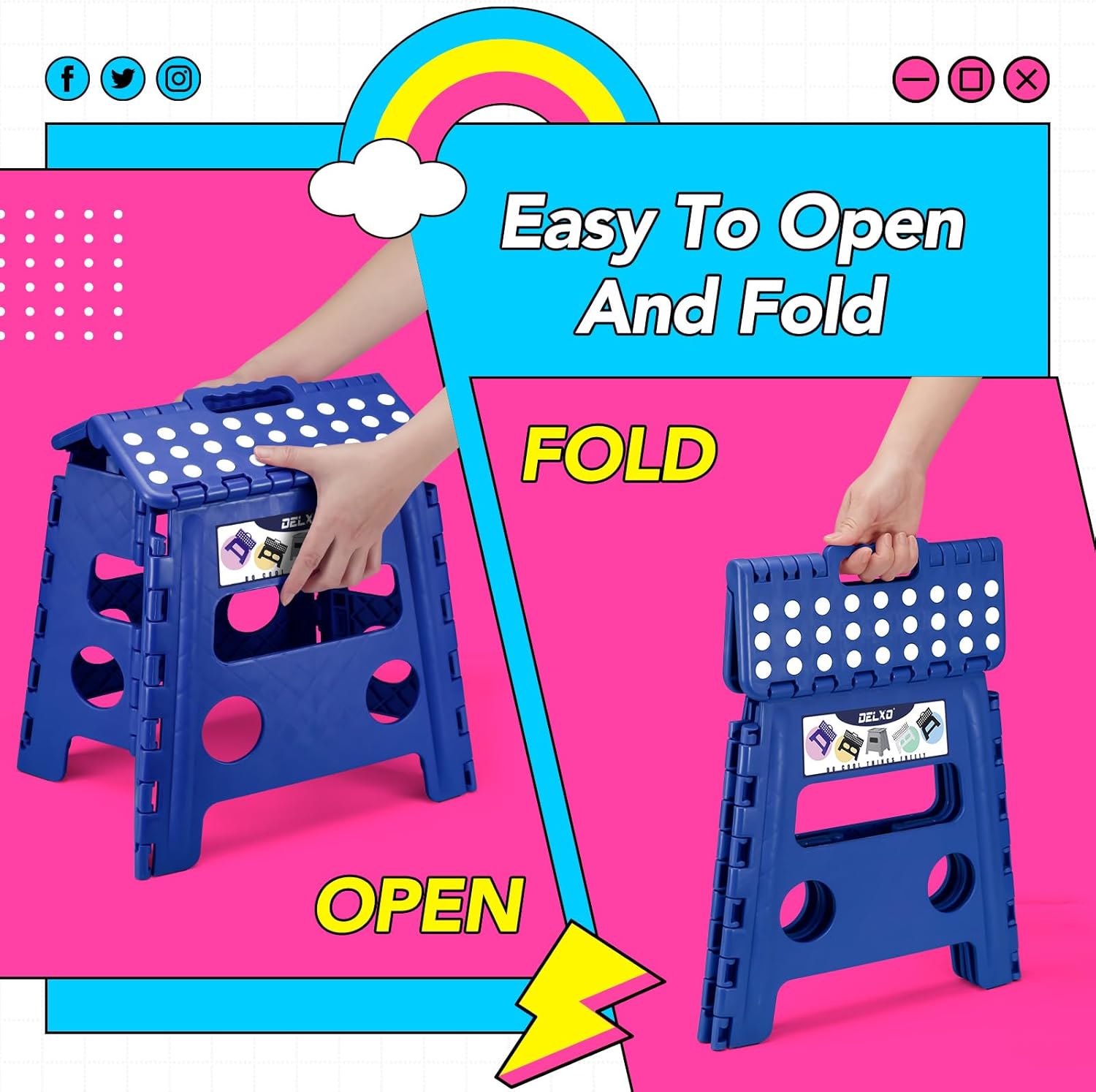 - Sturdy & Safe Foldable Step Stool : Our folding step stool is handy to have around for all sorts of occasions. Compact at 13"H×14"L×11"W when opened and 17.5"H ×13"L×1.2"W when folded, this durable and strong plastic step stool can support up to 300lbs. It is lightweight and versatile, and can be used both outdoors and indoors in the kitchen, bathroom or office