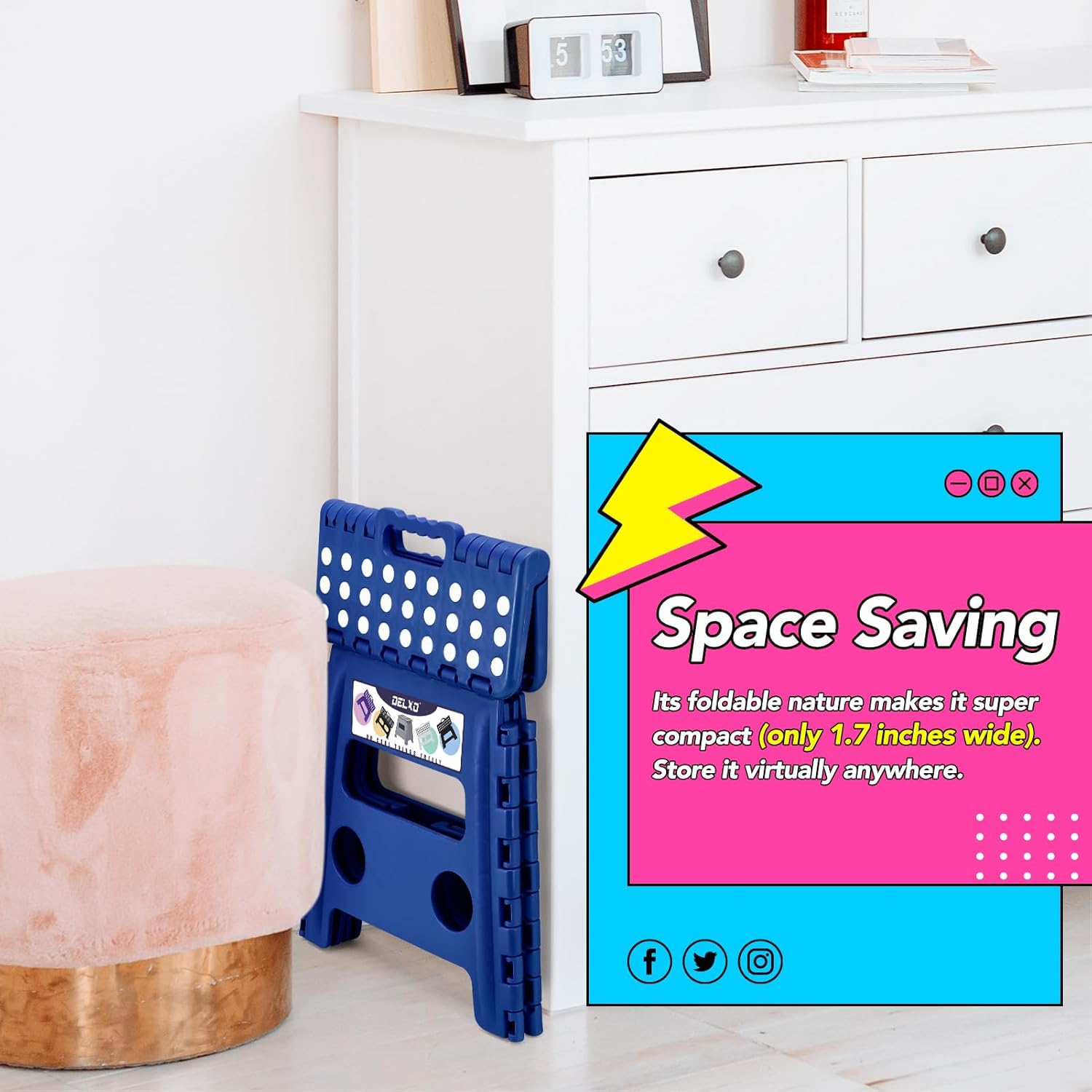 - Collapsible One-Step Stool : The grip-dot textured surface, anti-skid rubber feet design, and smooth rounded edges of this collapsible step stool makes it extra safe for children to use as they are protected from possible bruises that can result from sharp edges. It comes with a handle making it easy to carry around at home or outdoors when needed