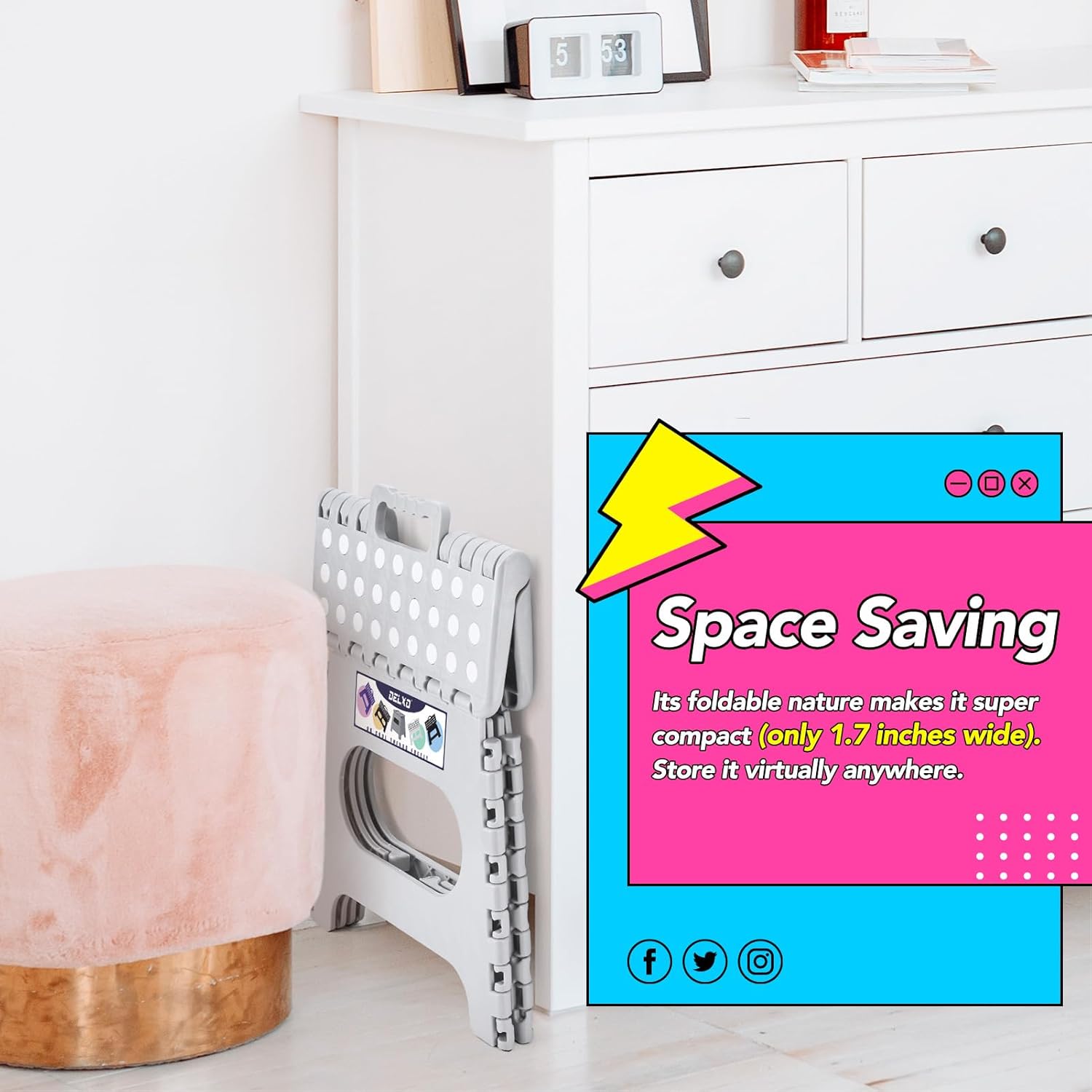 - Collapsible One-Step Stool : The grip-dot textured surface, anti-skid rubber feet design, and smooth rounded edges of this collapsible step stool makes it extra safe for children to use as they are protected from possible bruises that can result from sharp edges. It comes with a handle making it easy to carry around at home or outdoors when needed