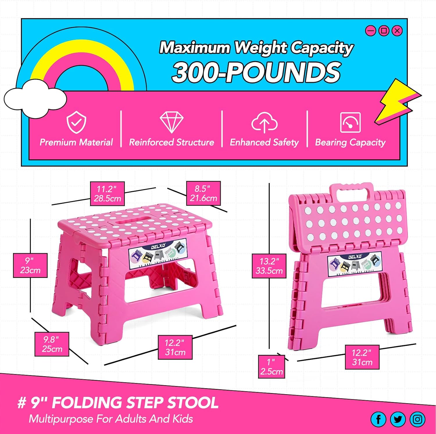 Delxo Folding Step Stool, 9 inch Non-Slip Foldable Stools Up to 300 LBS, Step Stool with Handle, Lightweight for Kitchen, Bathroom, Bedroom, Garden, Rose Pink, 1PC
