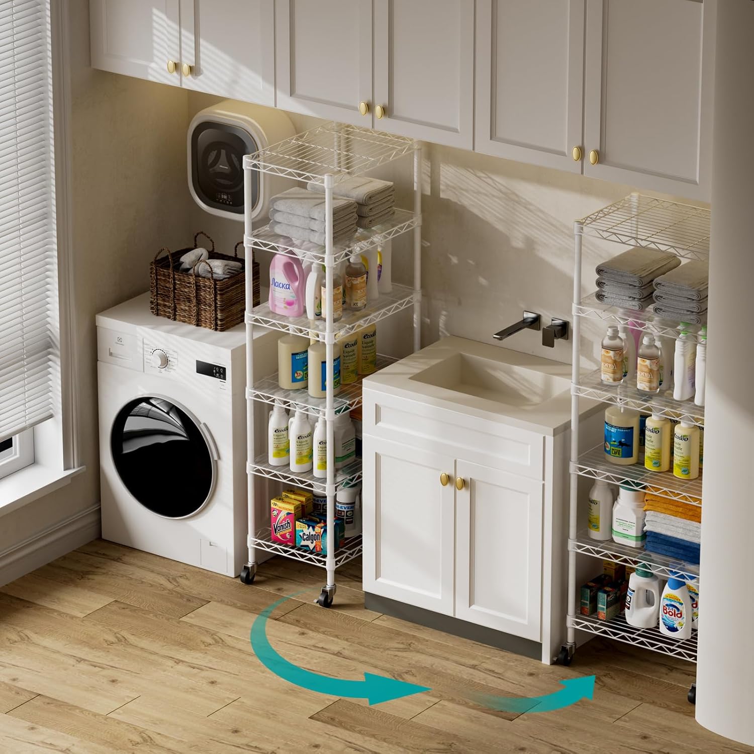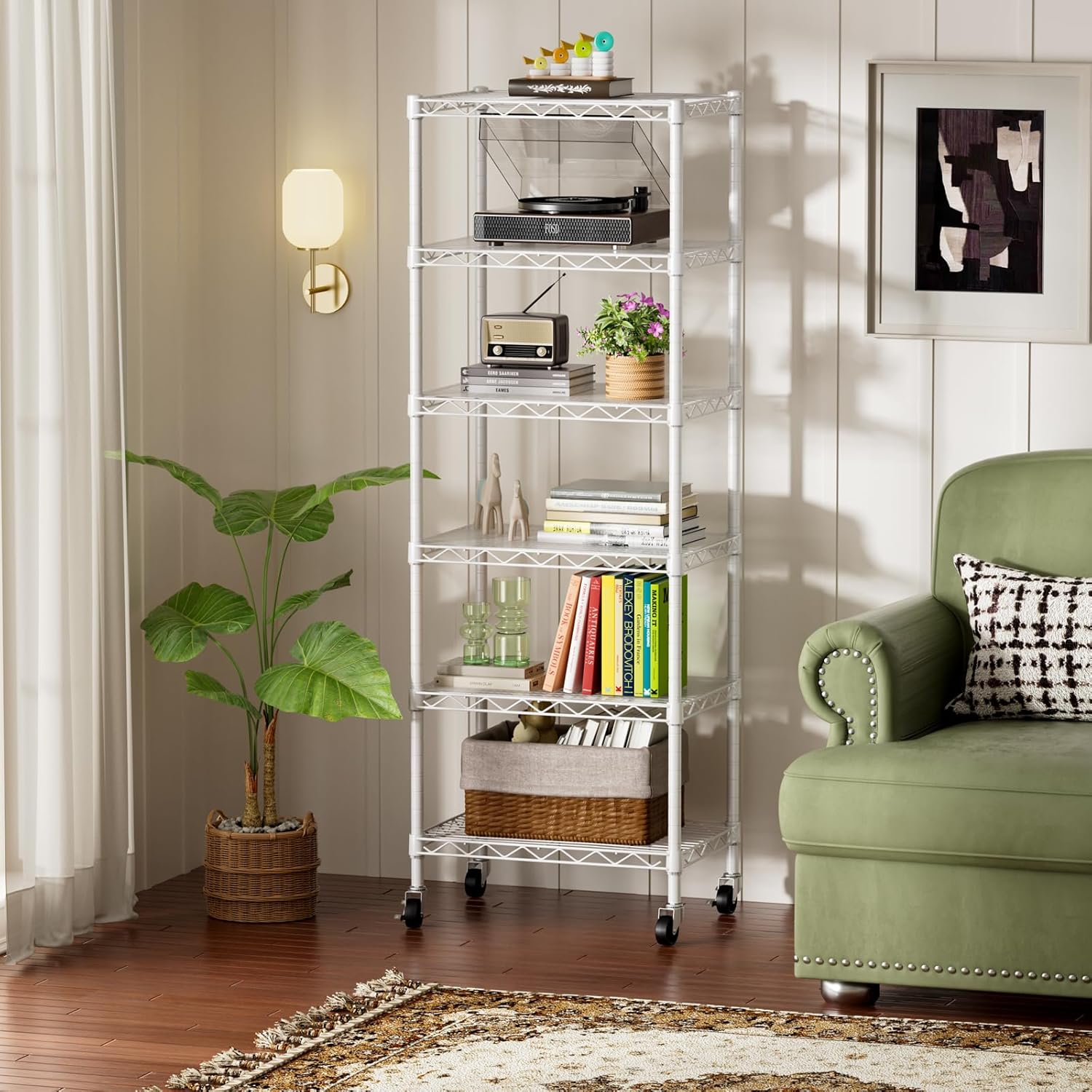 SINGAYE 6 Shelves Storage Shelf Wire Closet Bathroom Organizers Metal Pantry Kitchen Small Garage Shelving Unit Laundry Room Organization Home Narrow Rack Net Basket with Wheels White
